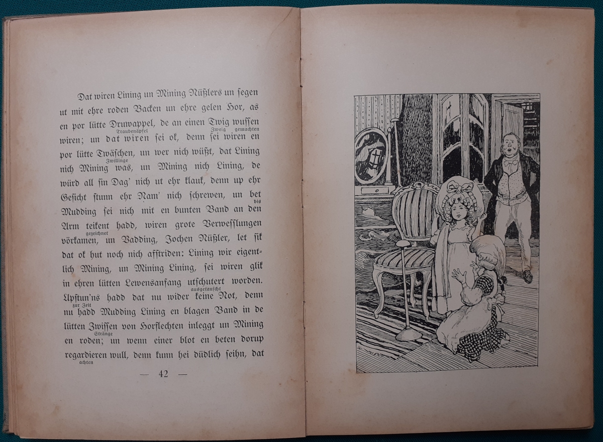 Werke von Fritz Reuter Neue illustrierte Ausgabe in zwei Bänden mit ausführlichem Wörterbuch in hochdeutscher Sprache, Hansa Verlag Hamburg, Ausgabe um 1900, 584 und 536 Seiten, 24seitiges Wörterbuch, sehr fester Voll-Leinen Einband, 24 x 18 cm, Zustand altersgemäß gut, Preis komplett: 24 EURO |