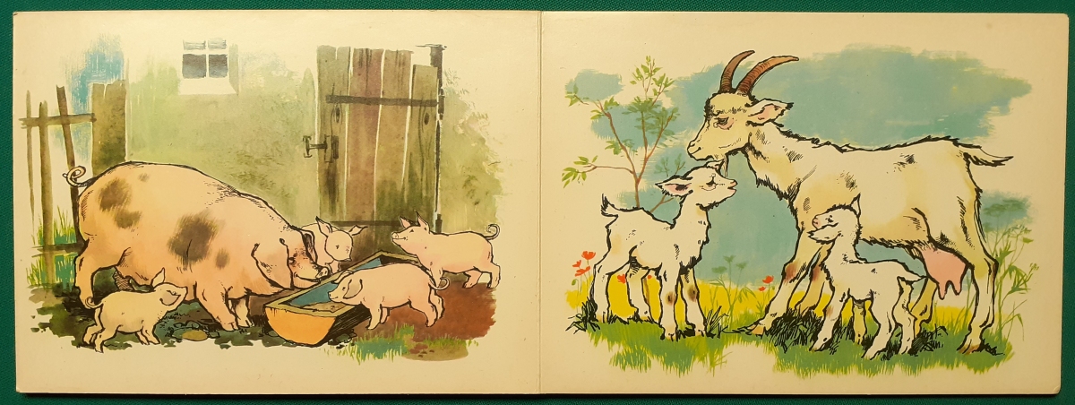 Rarität: Farmyard Favorites Junior Publishing, New York; Lizenzausgabe des Pestalozzi Verlags, Ausgabe um 1935, 12 Seiten sehr stabiler Hartkarton als Leporello gebunden mit Leinenbindung zwischen den Blättern; sehr schöne Illustrationen von ?? mit kleinen englischen Texten unterhalb der Bilder; Format jeder Seite 30 x 23 cm; hochwertige Verarbeitung; an den Buchkanten etwas bestoßen; insgesamt sehr guter altersgemäßer Zustand; Preis: 15 EUR |