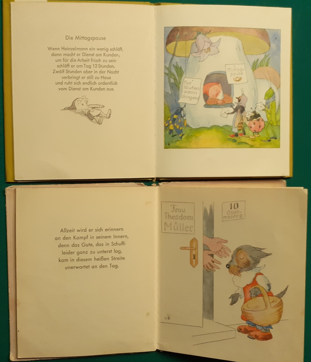 Abbildung links unten: Ausgabe um 1950; ca. 20 Seiten in normaler Druckschrift - nicht paginiert; mit noch farbenprächtigen Bildern; in mattem festen Hartpappeinband; Buchblock im Gelenk etwas gelockert und im Vor- und Nachsatz innen mit Tesafilm stabilisiert; an den Buchkanten bestoßen; innen z. T. gelbfleckig; insgesamt befriedigender altersgemäßer Zustand |