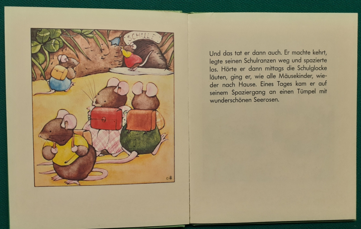 | Sara Ball | Vom Mäuschen, das die Schule schwänzte | Ausgabe um 1980; ca. 20 Seiten in normaler moderner Druckschrift - nicht paginiert; fester rundum lackierter Hartpappeinband; guter altersgemäßer Zustand | 4 |