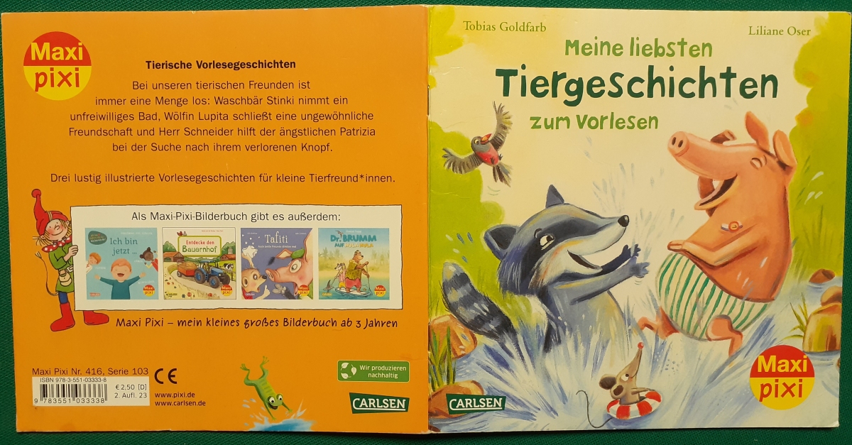 | 416 | Text von Tobias Goldfarb mit Bildern von Liliane Oser | Meine liebsten Tiergeschichten zum Vorlesen | Erstausgabe von 2023; leicht an den Buchkanten bestoßen; altersgemäßer guter Zustand | 1,50 |