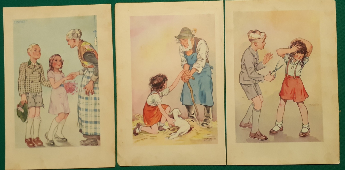 von Deckel-Illustrationen vom Schutzumschlag des Buches: Didi und Janne von Barbara Wiesen im Weichert Verlag, Berlin; Ausgabe von 1939; Format ca. 20 x 14 cm; oben an den Ecken mit kleinen Fehlstellen; unten rechts signiert; insgesamt recht guter altersgemäßer Zustand Preis: 2 EURO |
