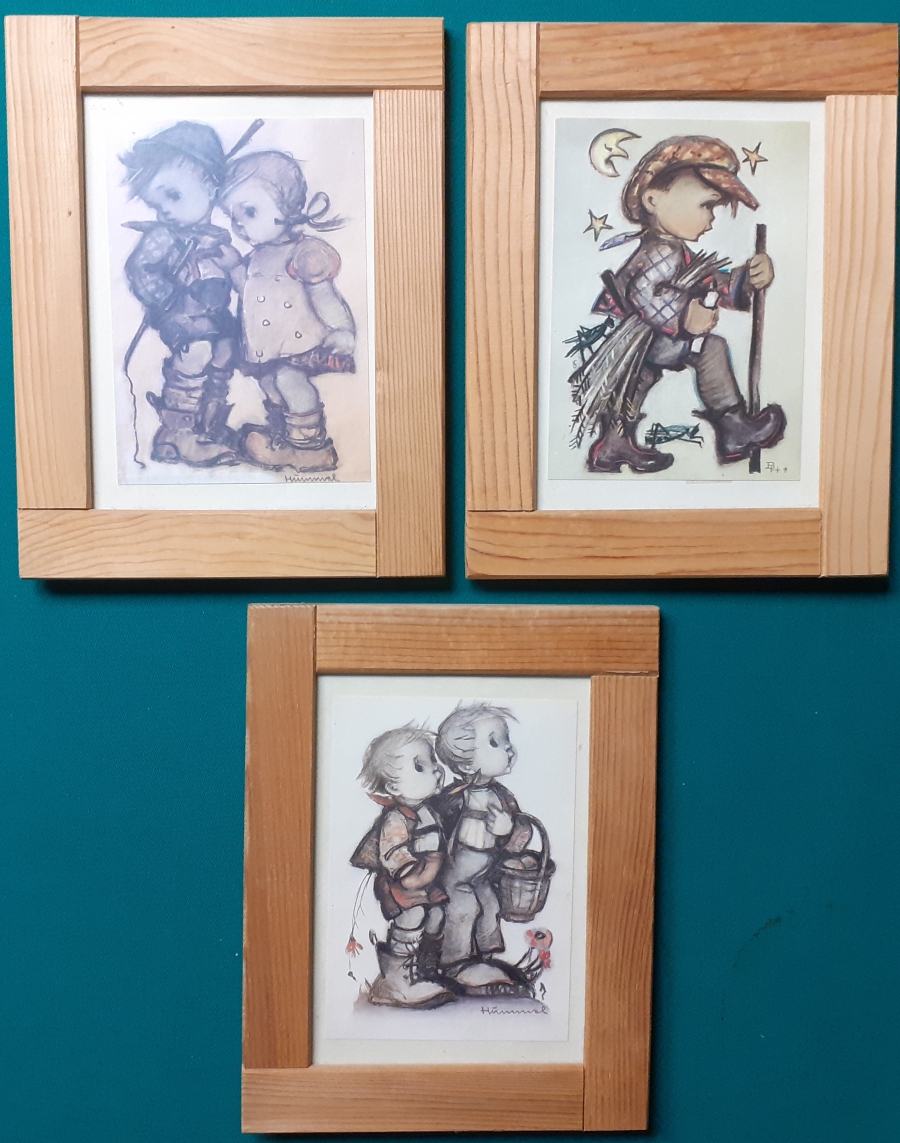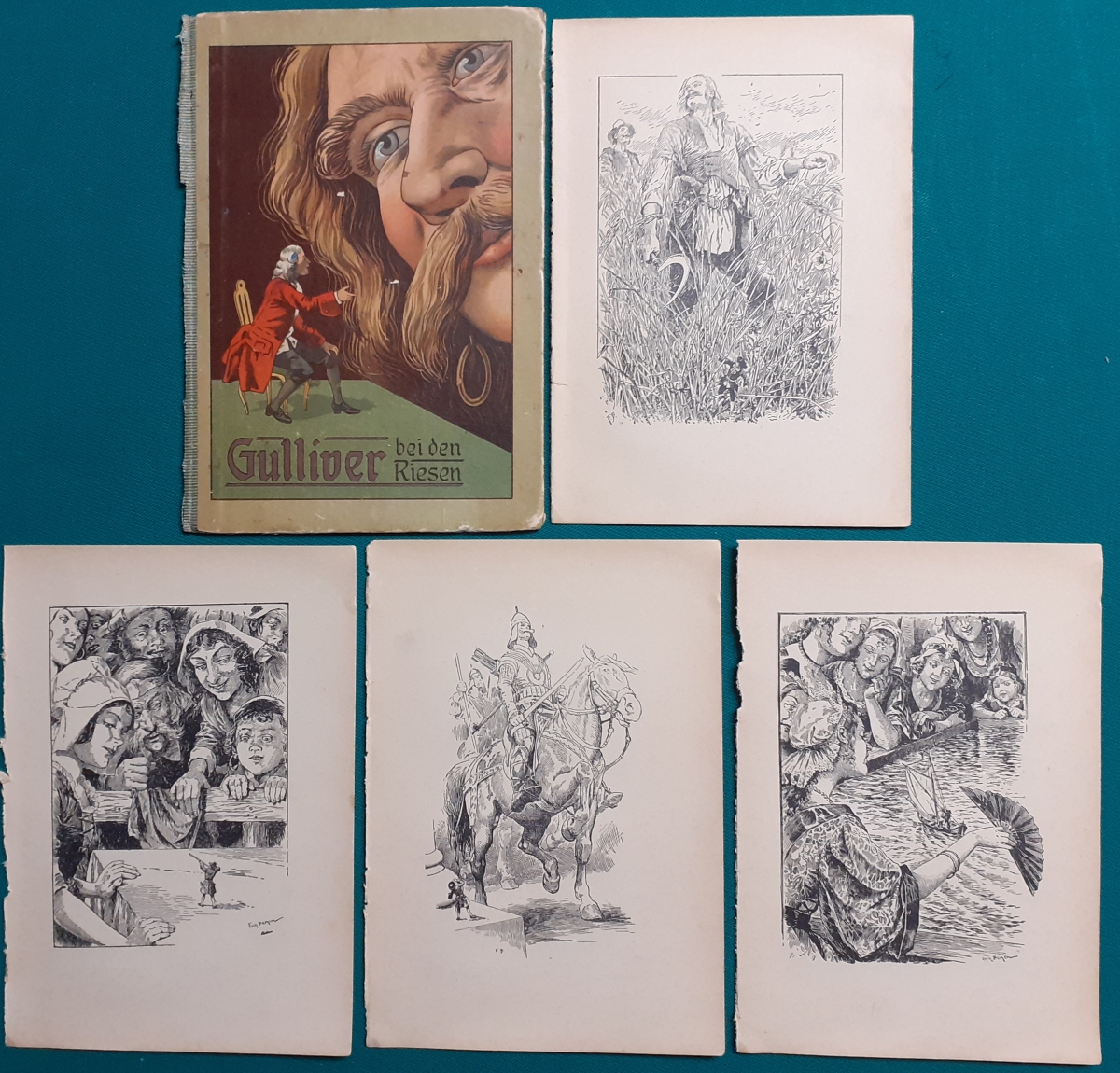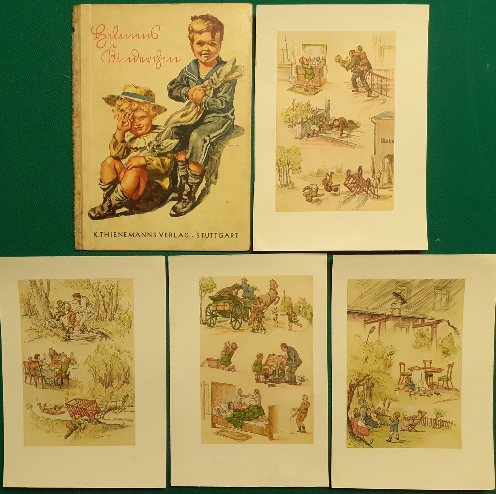 Werner Chomton: 5 Bilder aus dem Buch von John Habberton: Helenes Kinderchen; Thienemanns Verlag, Stuttgart; Ausgabe um 1930; es handelt sich um das Deckelbild auf festem Karton und dem kompletten Satz von vier farbigen Bildern aus dem Buch; jeweils Seidenglanzpapier; Format jeweils 20,5 x 14 cm incl. Passepartout; z. T. etwas unsaubere Schnittkanten; insgesamt noch in gutem altersgemäßen Zustand Komplettpreis der fünf Bilder: 4 EURO Hier zur Illustratoren-Galerie mit typischen Arbeiten von Werner Chomton |
