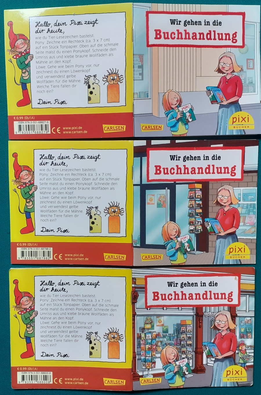 Werbepixis mit der Frau und dem Kind auf dem Cover gibt es in verschiedenen Cover-Varianten; Die Geschichten sind zwar identisch; aber die Hefte sind individualisiert: Das Cover ist immer etwas anders; auf den Doppelseiten 8/9 ist in jedem Heft eine "Buchladenfront" von außen abgebildet, auf der der Name der herausgebenden Buchhandlung zu sehen ist. Zudem ist auf der Umschlagseite 3 die herausgebende Buchhandlung aufgeführt. |