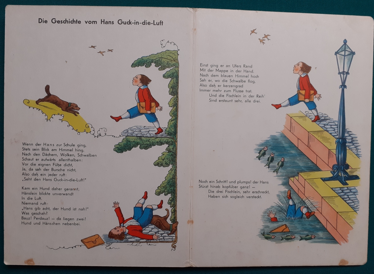 Heinrich Hoffmann: Ausgabe um 1950; alle 22 Seiten (incl. Einbandseiten) in besonders festem Hartkarton; Verlag unklar ??? (vermutlich Pestalozzi); Leinenrücken mit festem Hartpappeinband; Format 23,5 x 17 cm; Buchkanten bestoßen; vorderer Einband etwas fleckig; innen sauber; insgesamt guter altersgemäßer Zustand Preis: 12 EURO |
