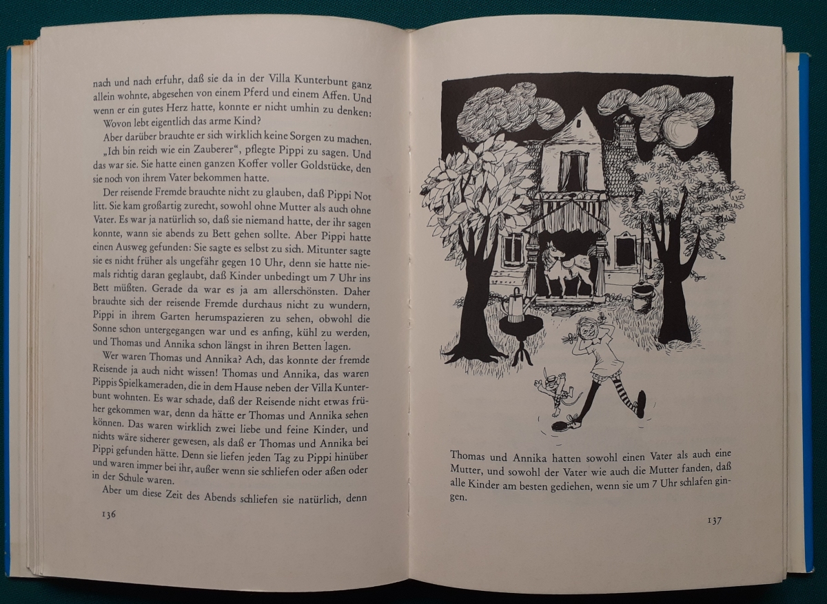 Langstrumpf- Pippi Langstrumpf Ausgabe von 1970, Illustrationen von Rolf Rettich, 390 Seiten, Großformat 24 x 16,5 cm, fester Voll Leinen Einband mit Hochglanz-Schutzumschlag, Papier-Schutzumschlag etwas beschädigt und schonend mit Tesafilm repariert; vorn innen Widmung; insgesamt guter altersgemäßer Zustand Zum Inhalt: Preis 12 EUR |