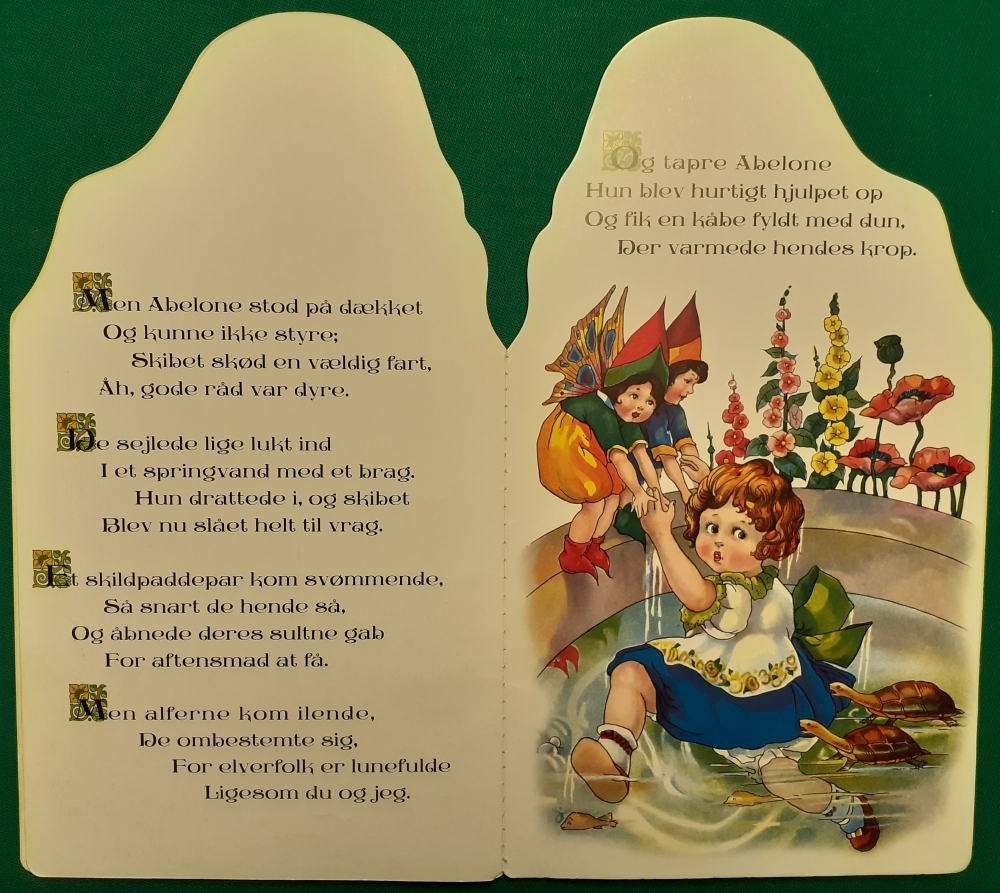 Abelones Elverkrone Tiger Studios, Seattle, Reprint 2006 von einer alten Litho-Ausgabe von 1915, wunderschön illustriert von Margaret Evans Price; 16 feste Hochglanz-Pappseiten - nicht paginiert - in dänischer Sprache; rundum lackierter Papp-Einband in Relief-Form im Riesenformat 34 x 19 cm; guter altersgemäßer Zustand Preis: 5 EURO |