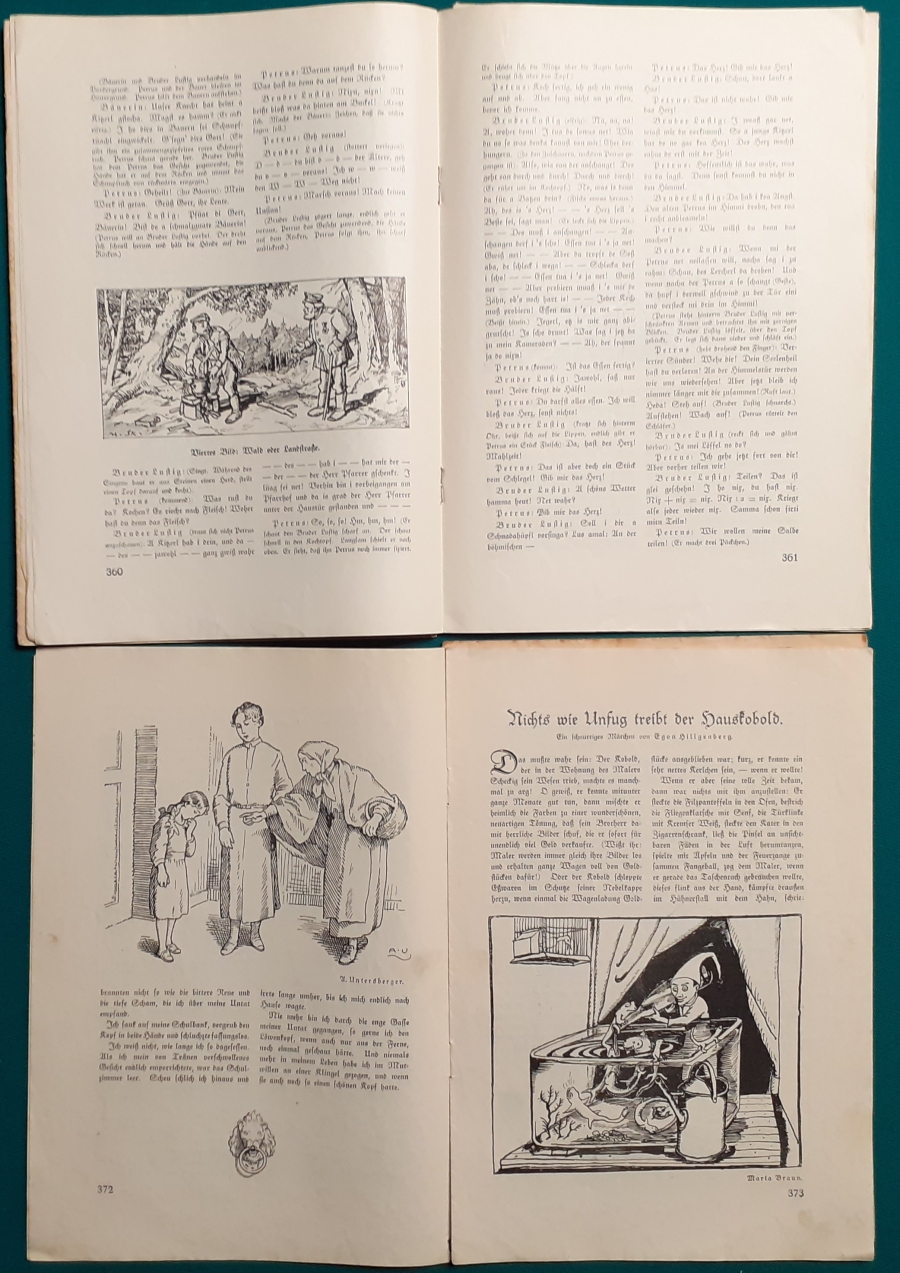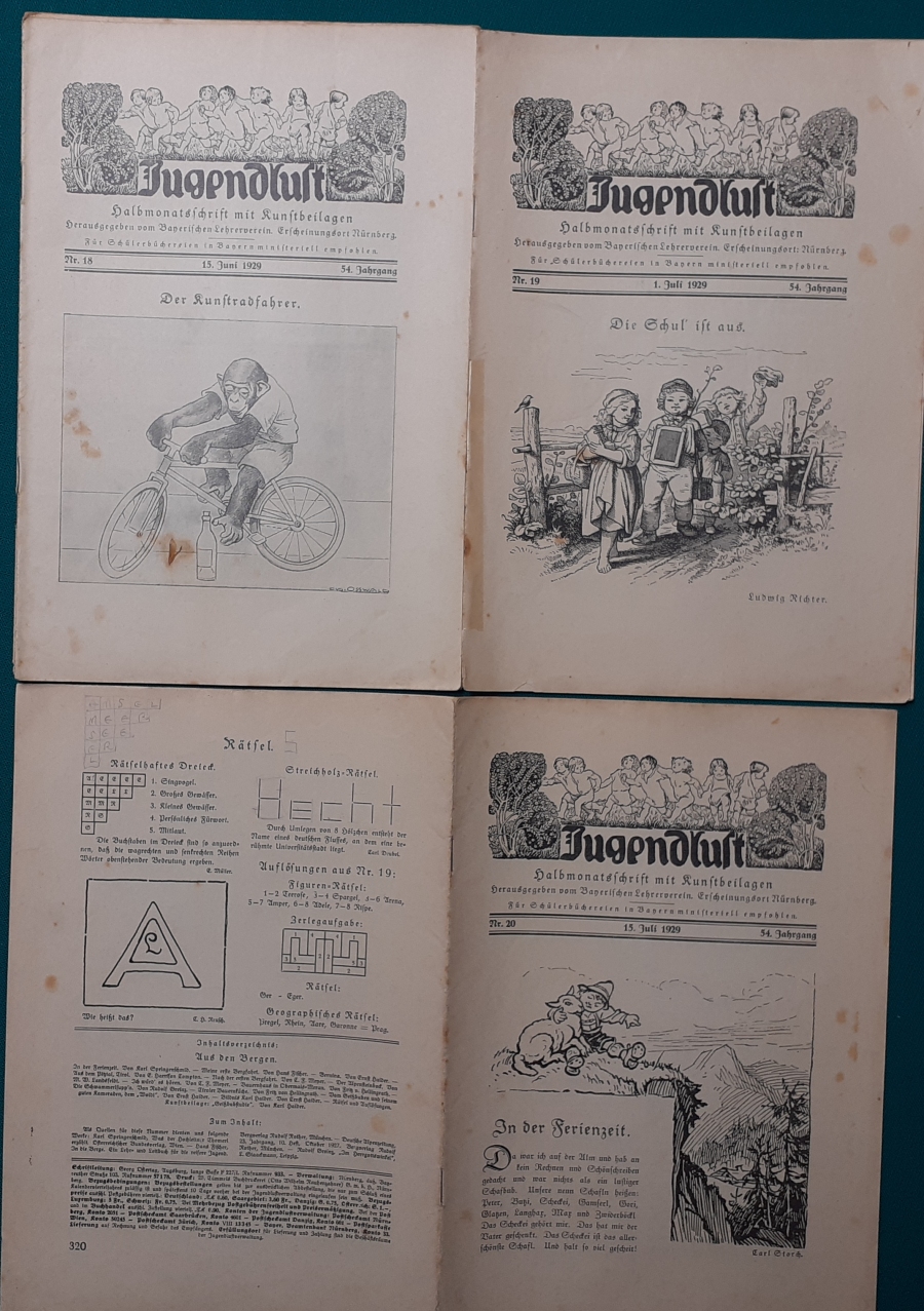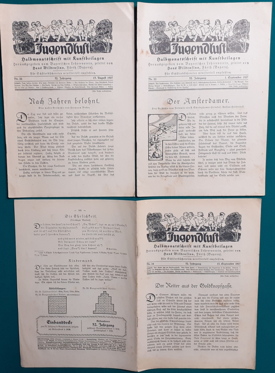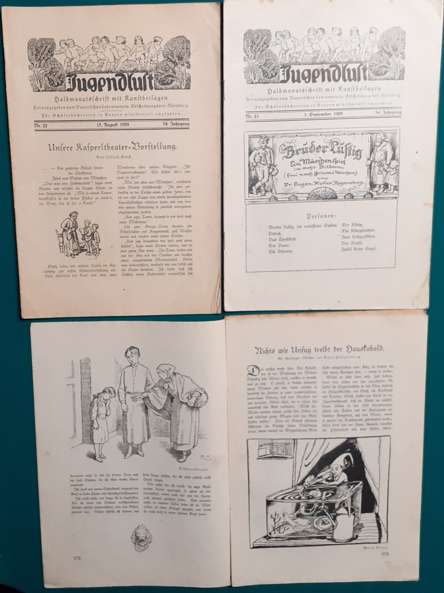Hrsg. Bayerischer Lehrerverein, Nürnberg; es handelt sich um halbmonatlich erscheinende 16 Seiten umfassende Schriften im Format 25 x 17 cm; mit sehr schönen Bildern namhafter Illustratoren, z.B. Else Wenz-Vietor, Hermann Stockmann, Carl Storch, Ernst Kreidolf u.a. Rubriken: Erzählungen, Märchen, Sagen, Briefe - Gedichte, Noten - Belehrendes - Zur Beschäftigung - Rätsel und Scherz - Kunstbeilagen - Aufführungen |