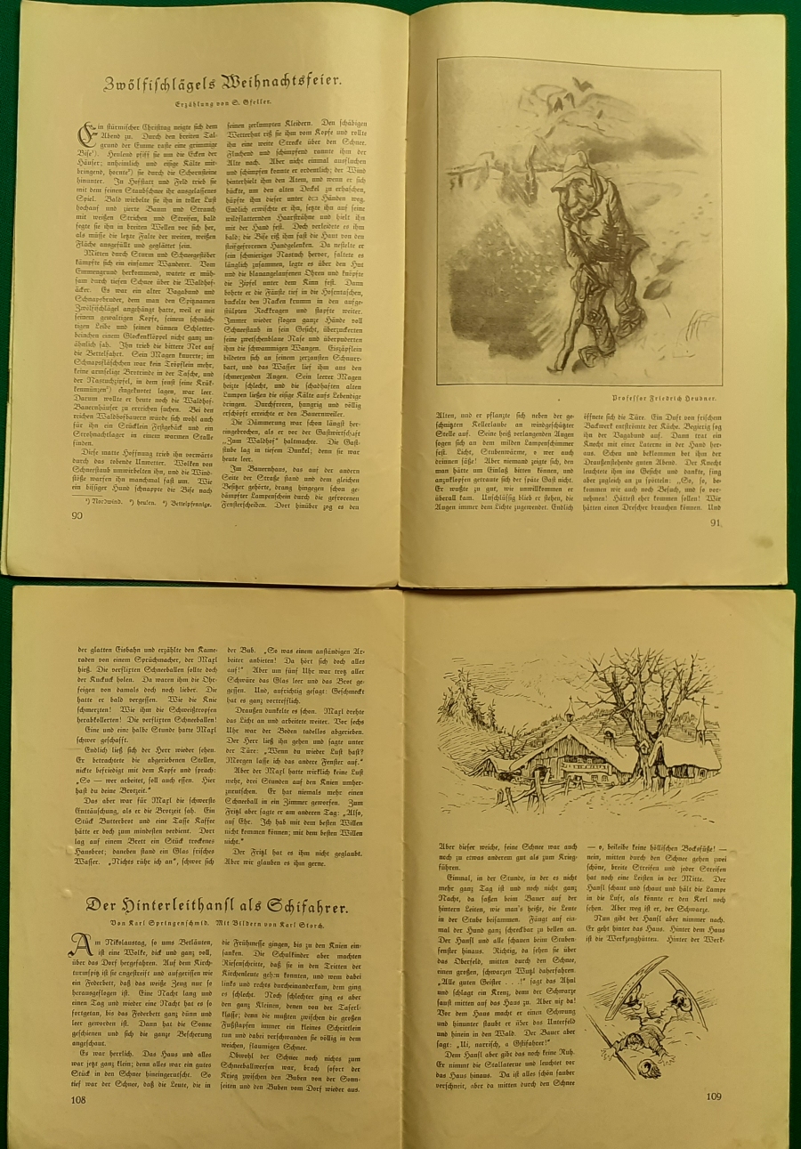 Kurt Arnold Findeisen mit Zeichnungen von Maria Braun: Ihr Kinderlein kommet; Hans Watzlik: Wunder der Weihnacht; Johann Meixner mit Bildern von E. Steigerwaldt: Christkinds Erdenfahrt; Hans Grimm: Im Gefangenenlager in Dahomey; Angelina Claus-Knoop mit Bild von Jo Franziß: Das Neue Licht |