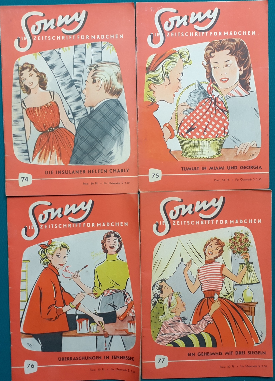 Eine heitere Serie für junge Mädchen von Georgia Carell (Pseudonym). Friedel Loeff (früherer Name: Friedel Heise), geboren 1906 in Osterode im Harz, war eine deutsche Schriftstellerin. Sie schrieb auch unter dem Pseudonym Georgia Carell. Ihr erster Detektivroman wurde 1936 veröffentlicht. Sie schrieb Kriminal- und Abenteuerromane wie „Die Kette“, „Vampire“, „Der Teufel von Shanghai“ sowie das Bühnenstück "Das schlichte Mädchen". Loeff lebte in Halle, Berlin und Frankfurt am Main. Erschienen im Verlag R. Glöss, Hamburg. Heftformat 21 x 15 cm, ab Heft 29 im Format 24 x 17 cm; Umfang je Heft 34 Seiten. Die Serie wurde von 1952 bis 1956 aufgelegt, ab der Nr. 83 vom Meteor Verlag; wenn nicht weiter erwähnt, handelt es sich jeweils um ein altersgemäß gut erhaltenes Exemplar mit entsprechenden leichten Gebrauchsspuren: leichte Einrisse und Bestoßungen an den Heftkanten, innen sauber, Heftrücken und Klammerung ok. Die graphische Ausstattung der Hefte besorgte Erika Kunstmann (1910-1969), Graphikerin, Schauspielerin und Kostümbildnerin, vh. mit Georg Thieß, Mutter der Schauspielerin Doris Kunstmann. Im Heft 81 dieser Reihe schreibt sie über Ihren Beruf. Zum Inhalt: |