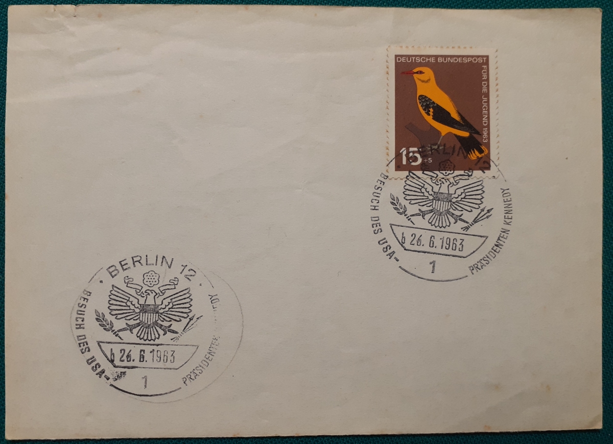 Datiert vom 25.6.1963: Besuch des US-Präsidenten Kennedy in Europa Offizieller Umschlag mit Sonderstempeln und der Marke Alt Berlin, 7 Pf ; ungelaufen; schöne Rundstempel; sehr guter altersgemäßer Zustand Preis: 3 EURO |