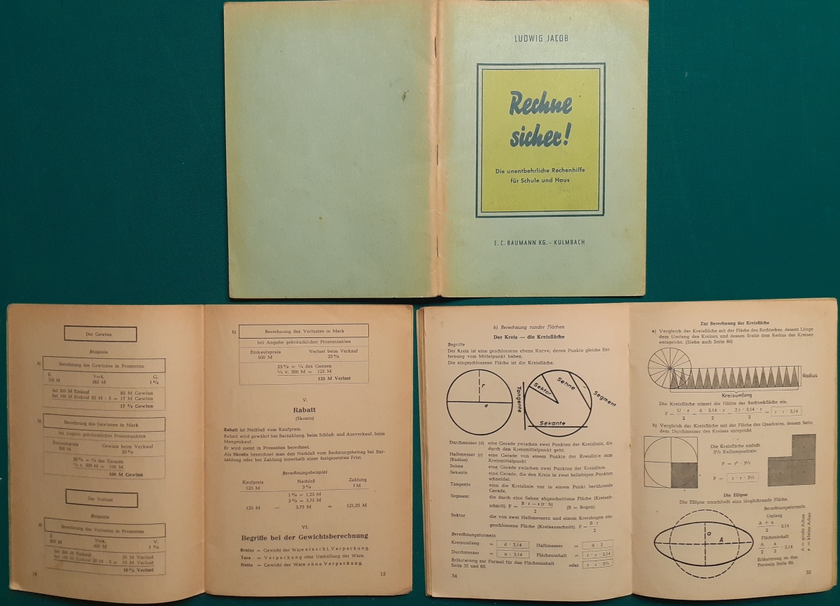 Rechne sicher! v. Ludwig Jacob; Baumann Verlag, Kulmbach; Ausgabe von 1954, Heft mit 64 Seiten im DIN A5 Format; gepflegt und noch recht guter altersgemäßer Zustand, Zum Inhalt: Preis 5 EUR |
