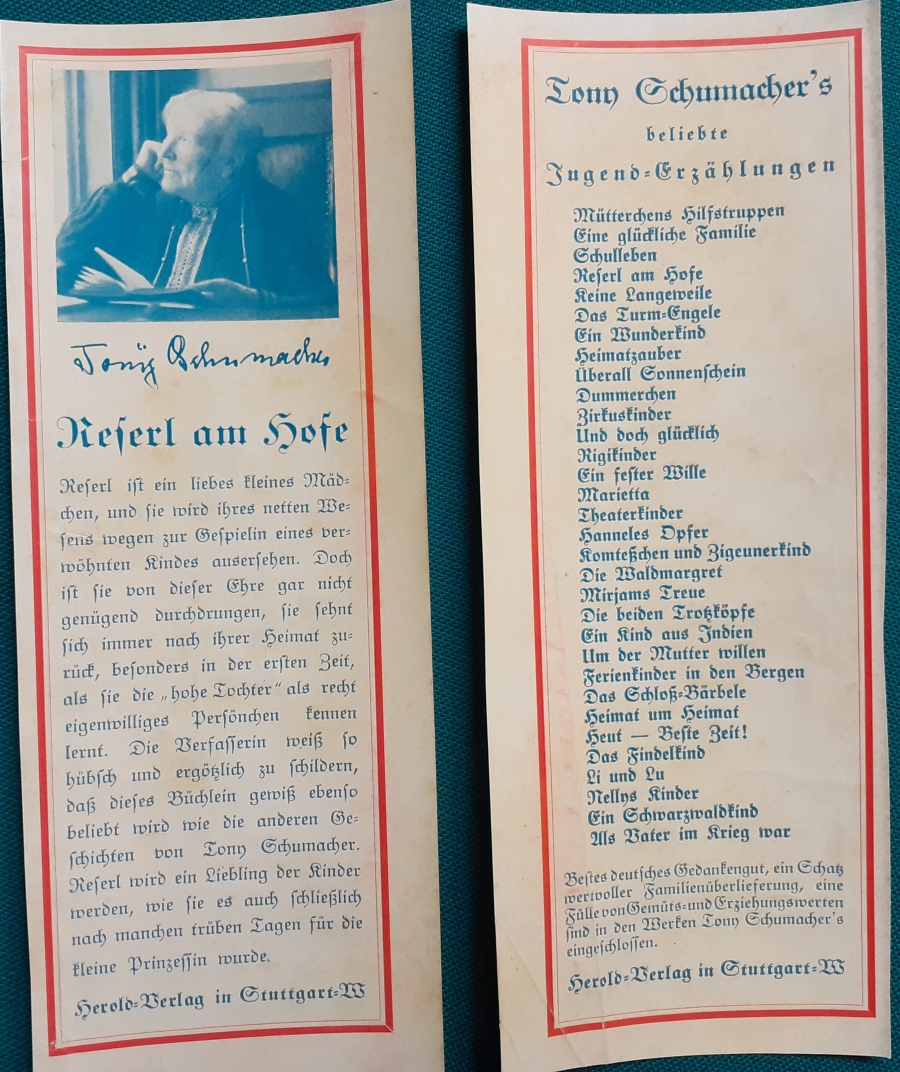 Präsentation des Buches von Ausgabe um 1925; Zwei Einzelblätter im Format von jeweils 18,5 x 7 cm - einseitig bedruckt (vermutlich Klappentexte eines Buchumschlags); Inhalt des Reserl-Buches; Aufstellung der Tony Schumacher-Bücher im Herold Verlag; Blätter in gutem altersgemäßen Zustand Preis 2 EUR |