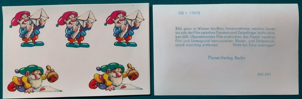 Ausgabe um 1970, Planet Verlag, Berlin. Es handelt sich um einen Bogen der Größe 14 x 9 cm mit 5 Zwergenmotiven zum Ablösen. Auf der Rückseite ist das Verfahren zur Ablösung beschreiben. Der Bogen ist in sehr gutem altersgemäßen Zustand Komplettpreis des Bogens: 2 EURO |
