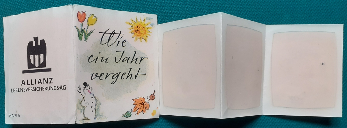 Wie ein Jahr vergeht Ausgabe um 1960, Hrsg. Allianz Versicherung. Es handelt sich um ein 4-seitiges Leporello mit der Seitengröße 5,5 x 4,5 cm mit 4 Motiven zu den Jahreszeiten. Die Bilder sind gummiert und mit Feuchtigkeit zu lösen. Das Leporello ist in ein Faltblatt eingeschlagen. Kleinere Knicke am Faltblatt. Der Bogen ist in gutem altersgemäßen Zustand. Komplettpreis des Leporellos: 5 EURO |