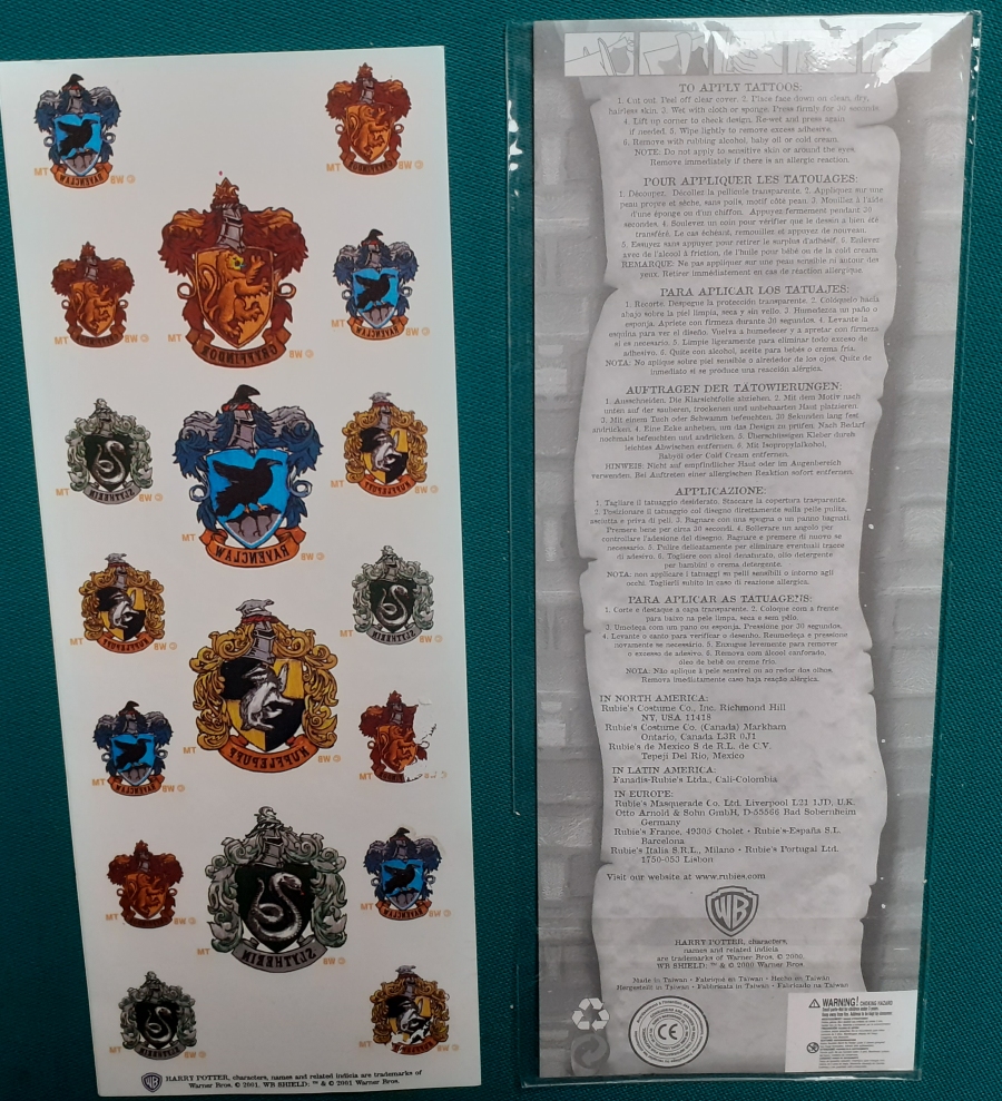 Harry Potter Tattoo Serie Ausgabe von 2001, Warner Brothers, es handelt sich um einen Bogen mit 14 kleinen und 4 großen Tattoos, die mit Feuchtigkeit gelöst werden sollen. Zwei Tattoos (unten rechts) sind leicht beschädigt. Auf der Rückseite des Bogens ist eine genaue Beschreibung zum Auftragen der Tattoos vermerkt. Der Bogen ist in sehr gutem altersgemäßen Zustand Komplettpreis des Bogens: 2 EURO |