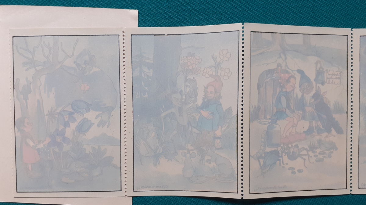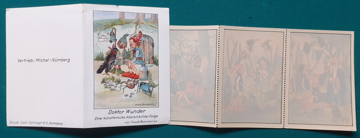 Doktor Wunder Ausgabe um 1955, Carl Schimpf, Nürnberg; Es handelt sich um ein 6-seitiges Leporello mit der Seitengröße 8,5 x 6 cm mit wunderschönen Wichtelmotiven von Traudl Bommarius. Die Bilder sind gummiert und mit Feuchtigkeit zu lösen. Das Leporello ist in ein Faltblatt eingeschlagen. Der Bogen ist in sehr gutem altersgemäßen Zustand.