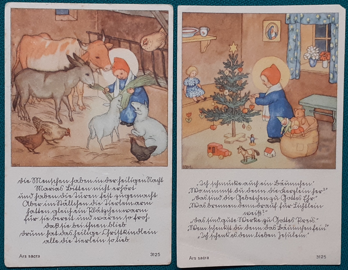 | FL 34: | 3 Motive: 2 x Krippe | ca. Anfang 1950er Jahre; großes Bild 8 x 5 cm; cm; etwas an den Rändern bestoßen; insgesamt recht guter altersgemäßer Zustand | 3 |