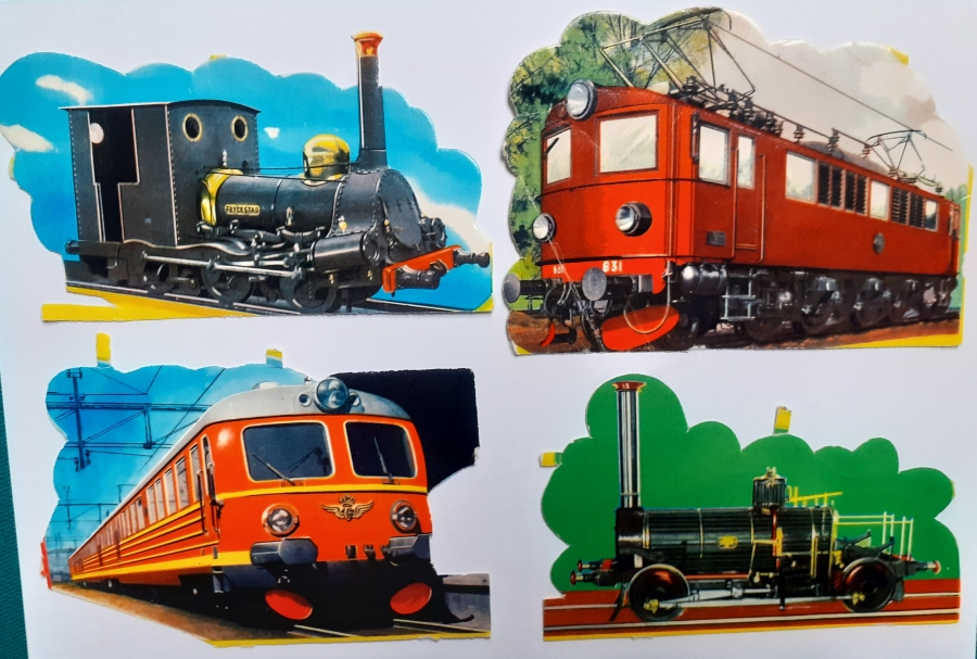 Stück 4 Eisenbahnen Schwedische Marken Größe: z. B. unten links 10 x 7 cm Oberfläche: glänzend Prägung: leicht Rückseite: Namen und technische Daten von ca.: 1960 Beschädigungen: z.T. Knicke |