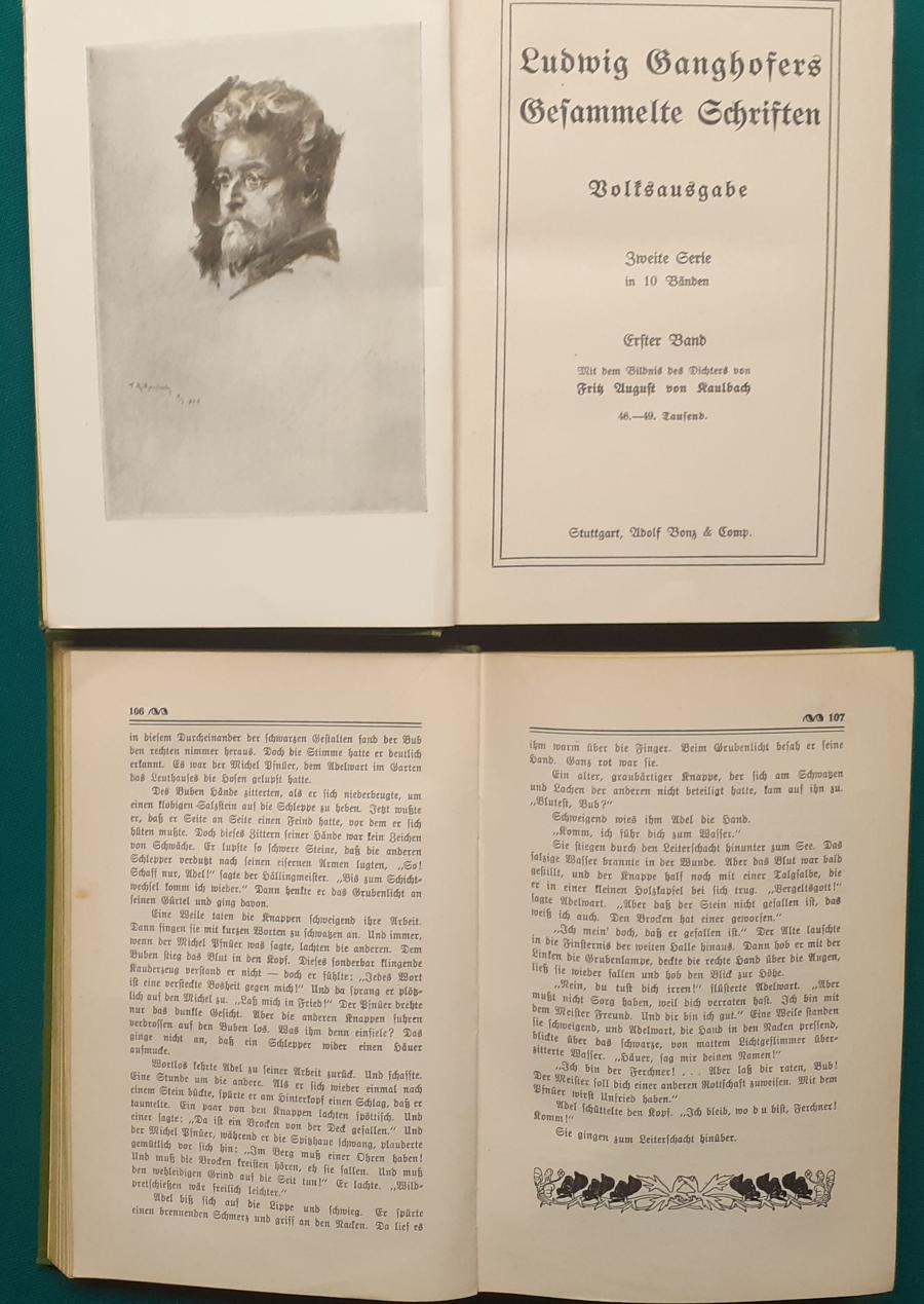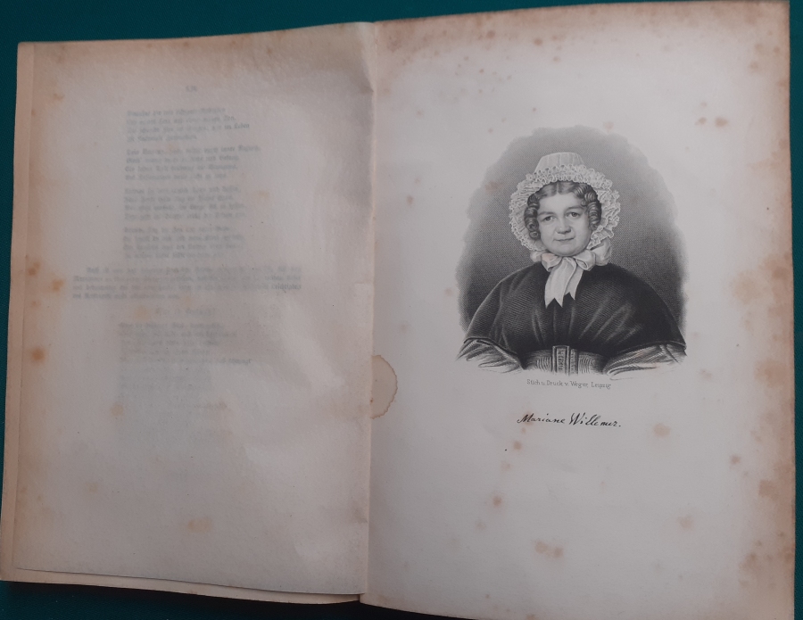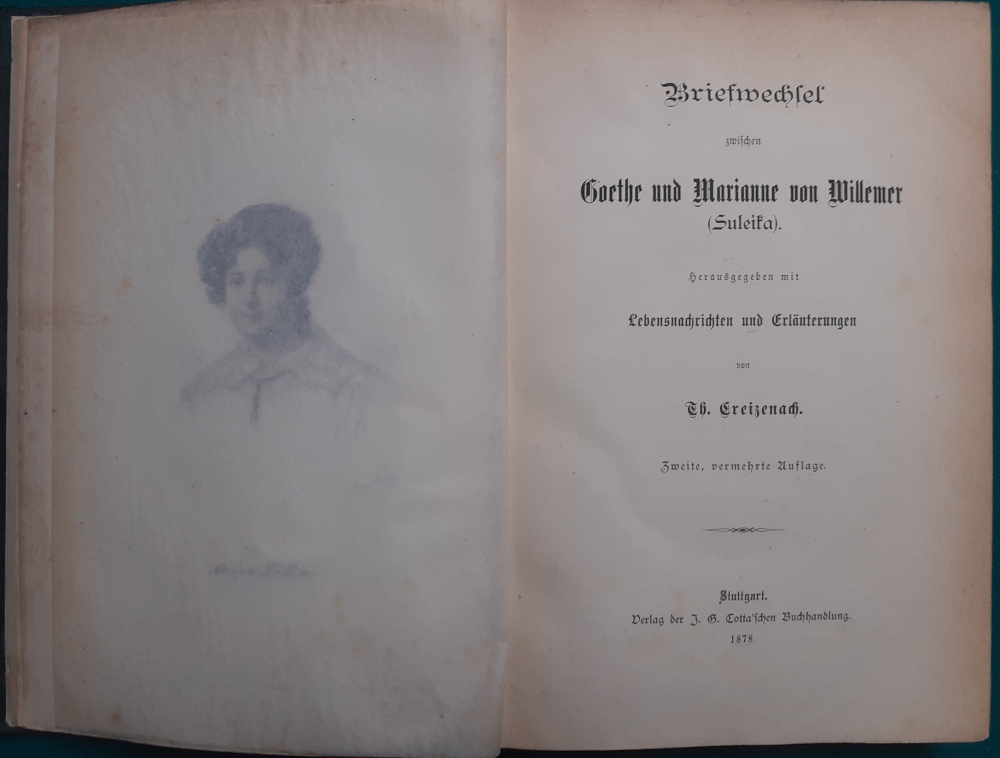 Goethe und Marianne von Willemer (Suleika) Cotta´sche Verlagsbuchhandlung, Stuttgart; Ausgabe von 1878!!; 356 Seiten; mit Portraits und Landschaftsaufnahmen; Voll-Leinen-Einband; am Rücken ist die Stoffbespannung auf einer Seite etwas eingerissen und wurde nachgeleimt; Buchblock im Gelenk hinten etwas gelockert und im Nachsatz innen mit Klebeband schonend stabilisiert; Bindung ansonsten noch sehr fest und alle Seiten fest verbunden; Einband fleckig - vermutlich nach abgetrockneten Feuchtigkeitsschäden; innen noch recht schön und insgesamt befriedigender altersgemäßer Zustand Preis: 6 EUR |