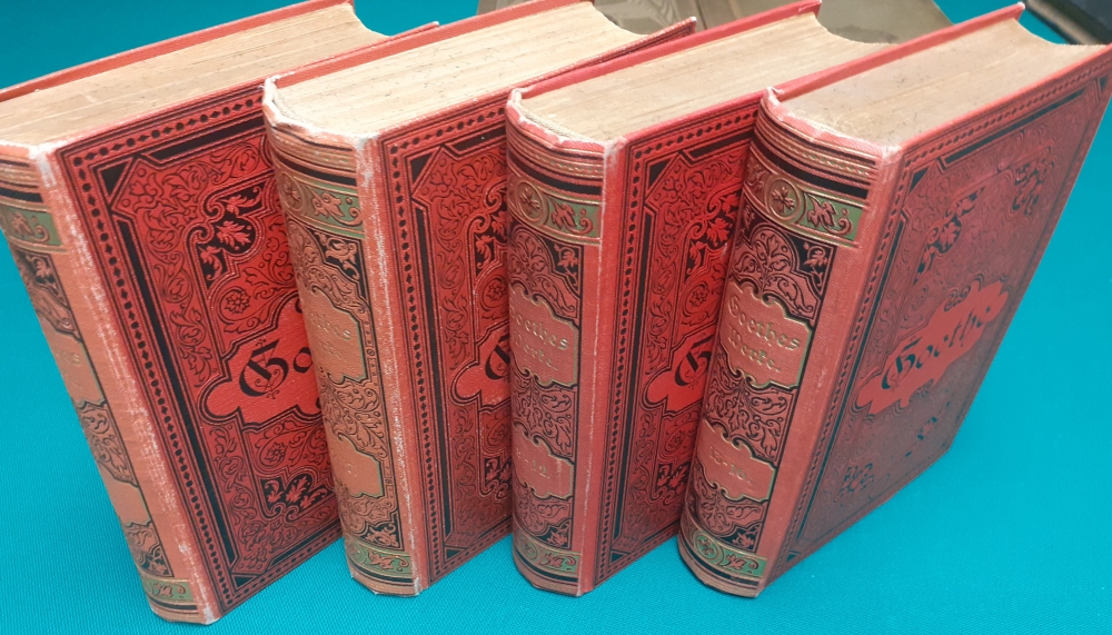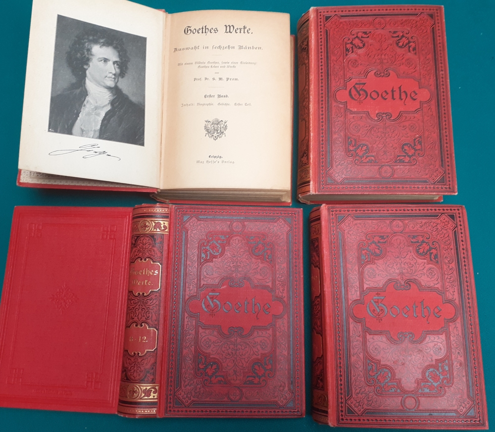Goethes Werke Hesse´s Verlag, Leipzig; Reihe um 1900; es handelt sich um 4 dekorative Bücher ( = vollständig in 16 Bände aufgeteilt) in Voll-Leinen mit goldenem Rückenschild im Format 17 x 11,5 cm. Bände leicht bestoßen, insgesamt aber in sehr gutem altersgemäßen Zustand