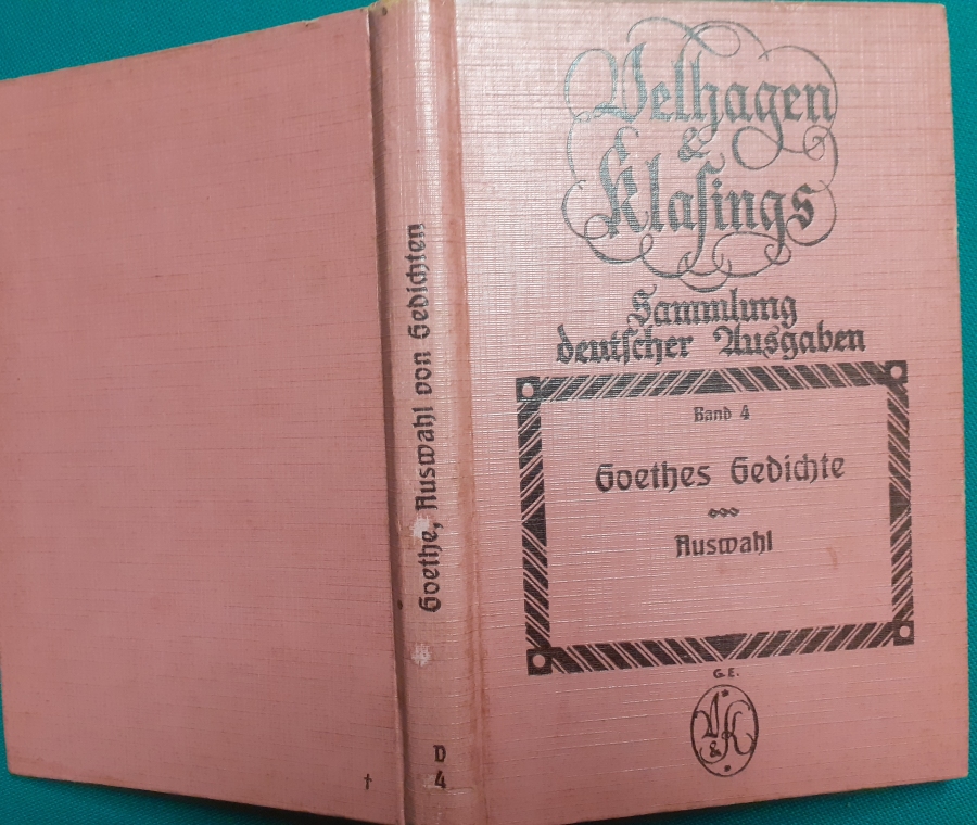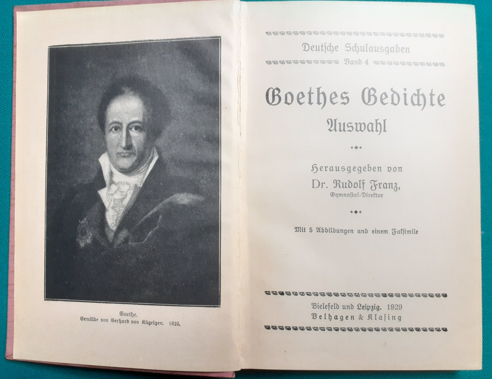 Goethes Gedichte Auswahl Velhagen und Klasing Bielefeld u.a.; Ausgabe von 1929; Hrsg. Rudolf Franz; mit 5 Abbildungen und einem Faksimile; 198 Seiten; Voll-Leinen, guter altersgemäßer Zustand Preis: 5 EUR |