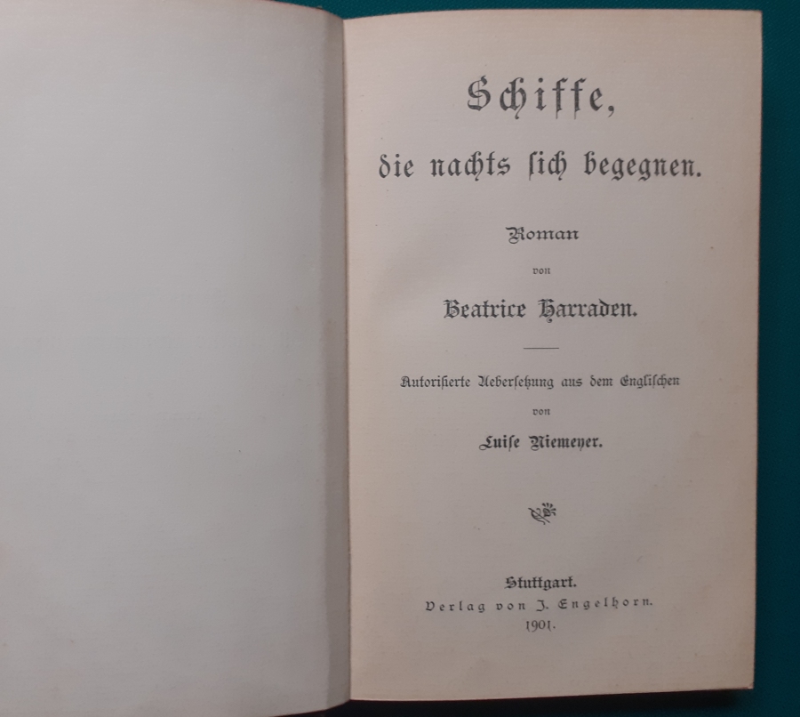 Harraden Schiffe, die nachts sich begegnen Roman Engelhorn Verlag Stuttgart; Erstausgabe von 1901, 160 Seiten; sehr dekorativer Voll-Leinen-Einband; guter altersgemäßer Zustand Preis 7 EUR |