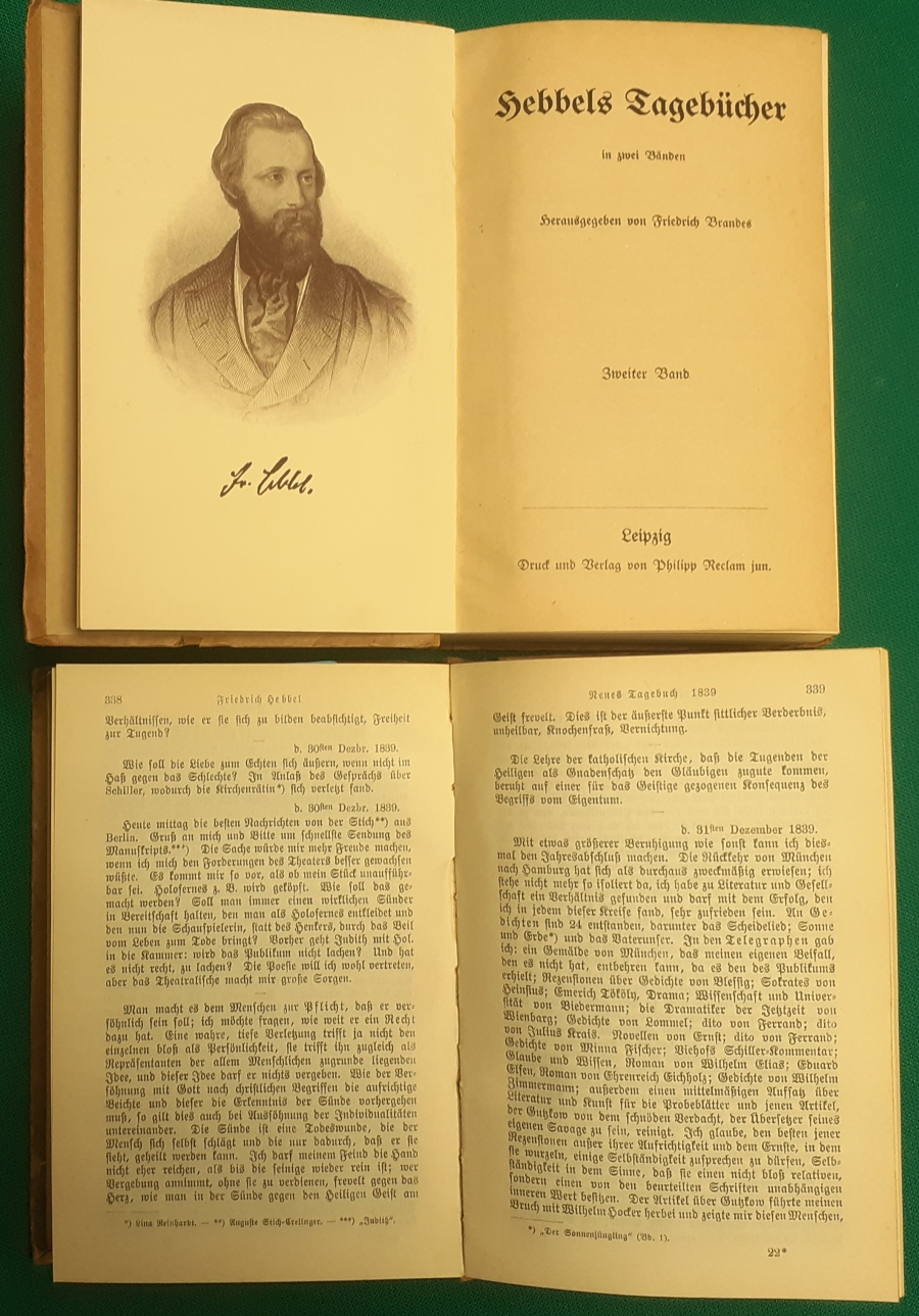 Tagebücher Reclam Verlag Leipzig; Ausgabe von 1913; jeweils Leinenrücken mit Hartpappeinbänden mit 680 und 650 Seiten; Vorsatzseiten innen im ersten Band mit Klebeband zum Rücken stabilisiert, Buchkanten bestoßen; insgesamt beide Bände in befriedigendem altersgemäßen Zustand Preis komplett: 14 EUR |