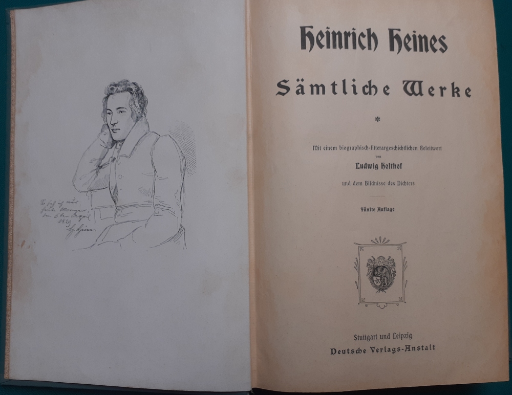 Heinrich Heines Sämtliche Werke Deutsche Verlagsanstalt Stuttgart u.a.;5. Auflage um 1910 mit einem biographisch-literaturgeschichtlichen Geleitwort (20 Seiten) von Ludwig Holthof und dem Bildnisse des Dichters; 1040 Seiten!!!; sehr fester Voll-Leinen-Einband; vorn innen eine Widmung von 1916; leicht an den Buchkanten bestoßen; insgesamt guter altersgemäßer Zustand Preis: 19 EUR |
