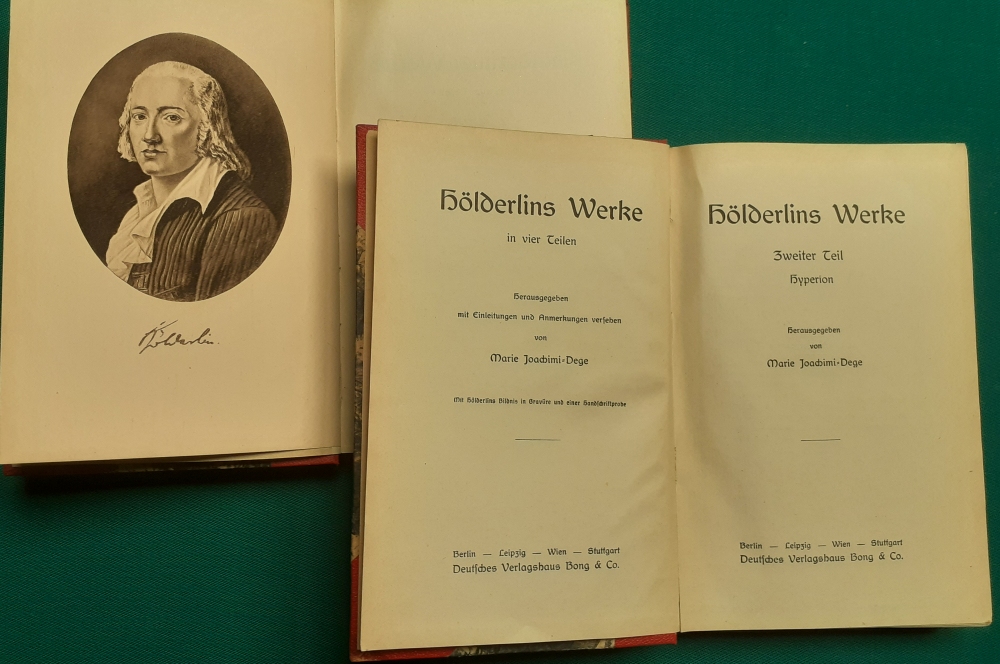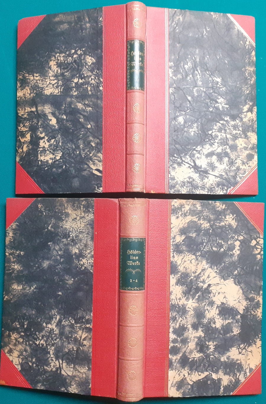 Hölderlin: Hölderlins Werke in vier Teilen (= 2 Bücher) Deutsches Verlagshaus Bong, Berlin u.a.; Ausgabe um 1900, 308, 226, 112 und 190 Seiten in zwei Büchern aufgeteilt; Lederrücken mit festem Hartpappeinband und dekorativen Lederecken; guter altersgemäßer Zustand Zum Inhalt: Erster: Teil: Gedichte; Zweiter Teil: Hyperion; Dritter Teil: Empedokles; Vierter Teil: Übersetzungen - Theoretische Schriften Komplettpreis: 15 EUR |