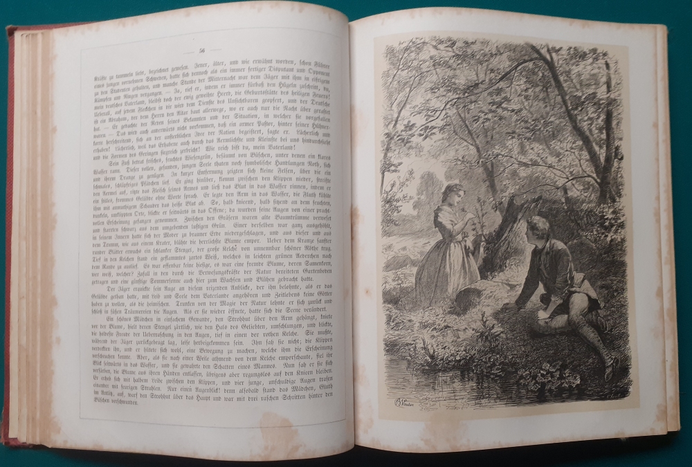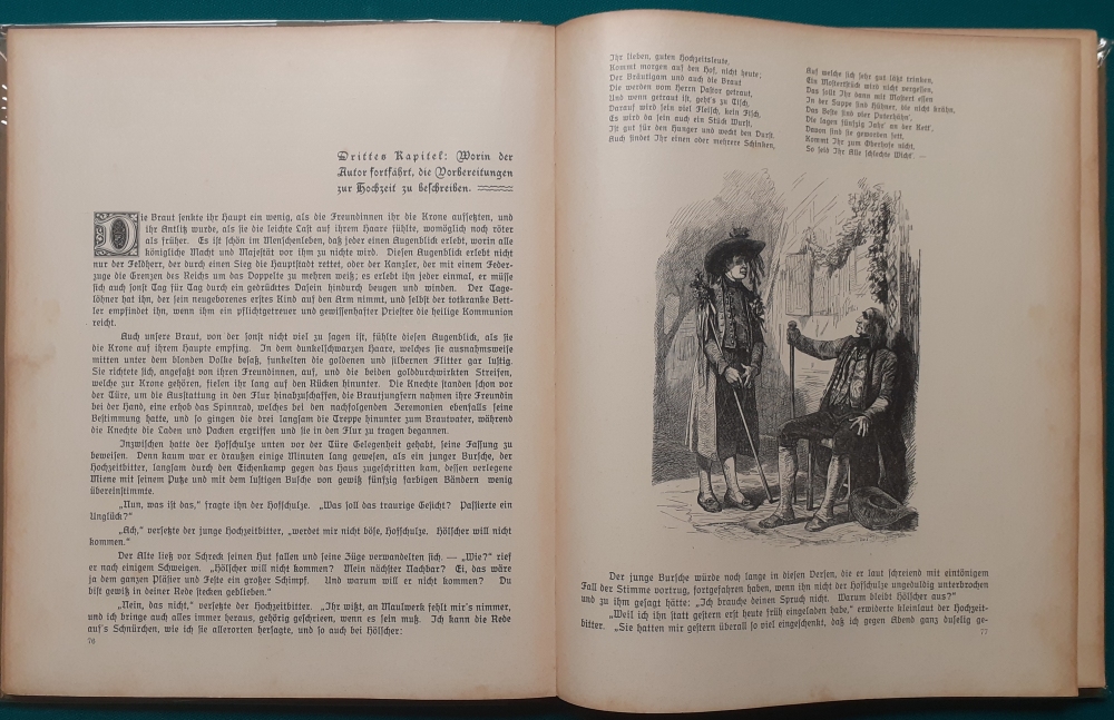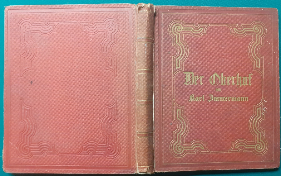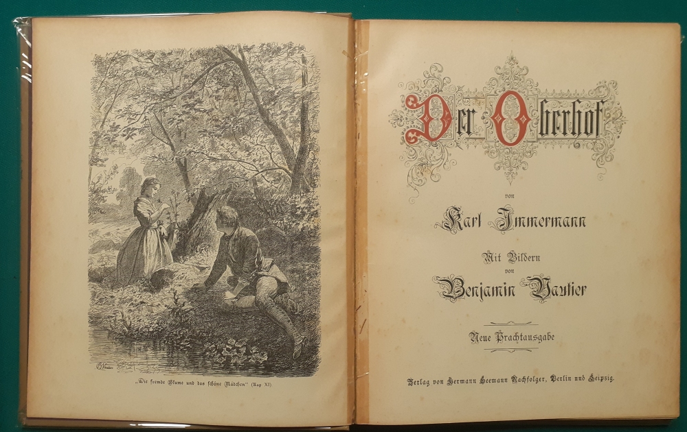 Karl Immermann: Der Oberhof - mit Bildern von Benjamin Vautier - Neue Prachtausgabe im Seemann Verlag Berlin u.a., Ausgabe um 1900, Voll-Leinen, 26,5 x 22,5 cm, 220 Seiten, Buchbindung etwas locker, vordere und hintere Umschlagseiten mit Klebeband zum Rücken stabilisiert, innen z.T. ein wenig gelbfleckig; insgesamt noch guter altersgemäßer Zustand; Buch zum Schutz in Cellophan eingeschlagen Preis 19 EUR |