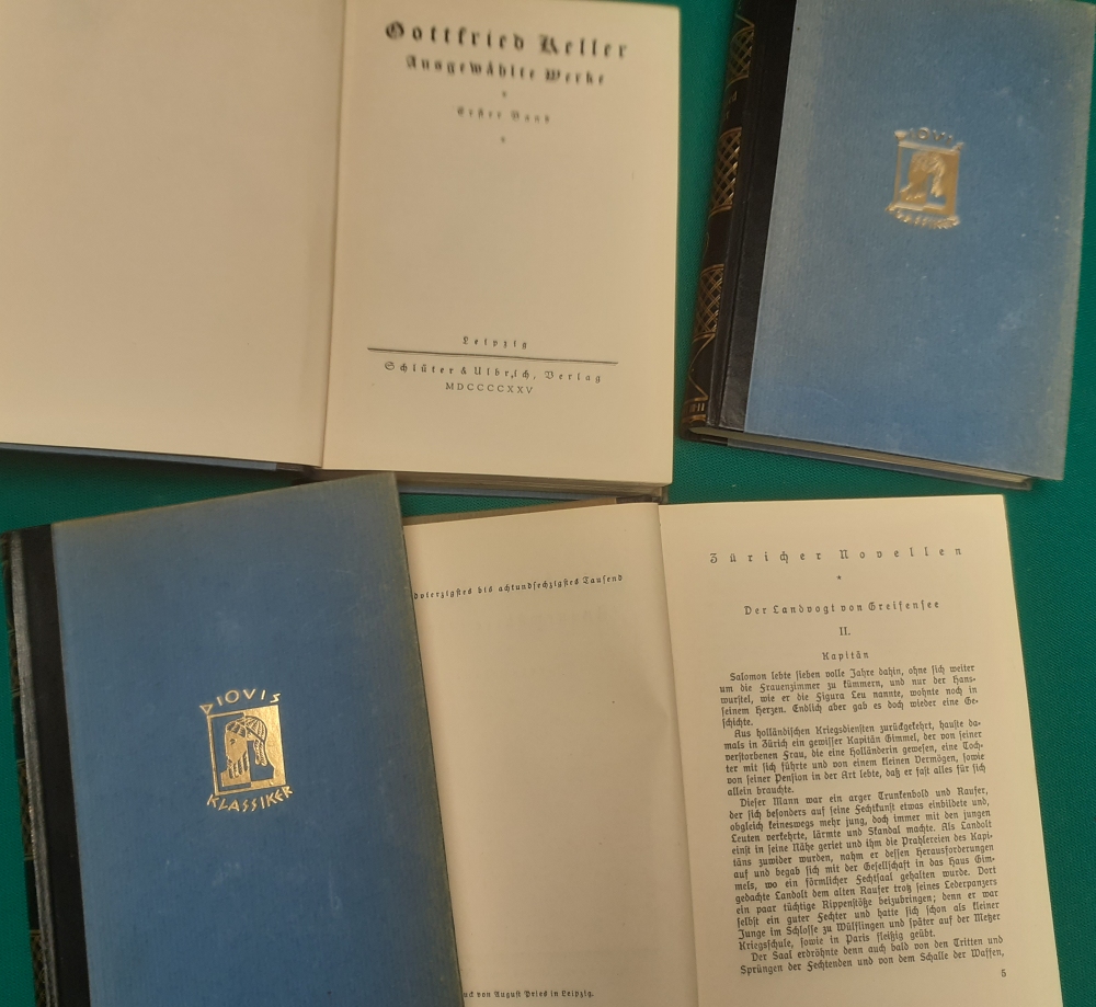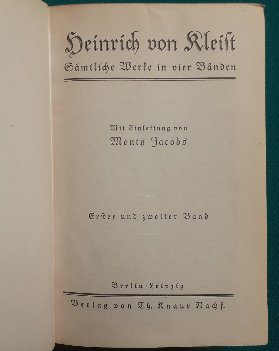 Heinrich von Kleist Sämtliche Werke Knaur Verlag, Berlin u.a.; Biografie von Monty Jacobs, Ausgabe um 1910, Lederrücken und -Ecken mit festem Hartpappeinband; ca. 820 Seiten, etwas an den Buchkanten bestoßen; altersgemäß guter Zustand, Preis: 14 EURO |