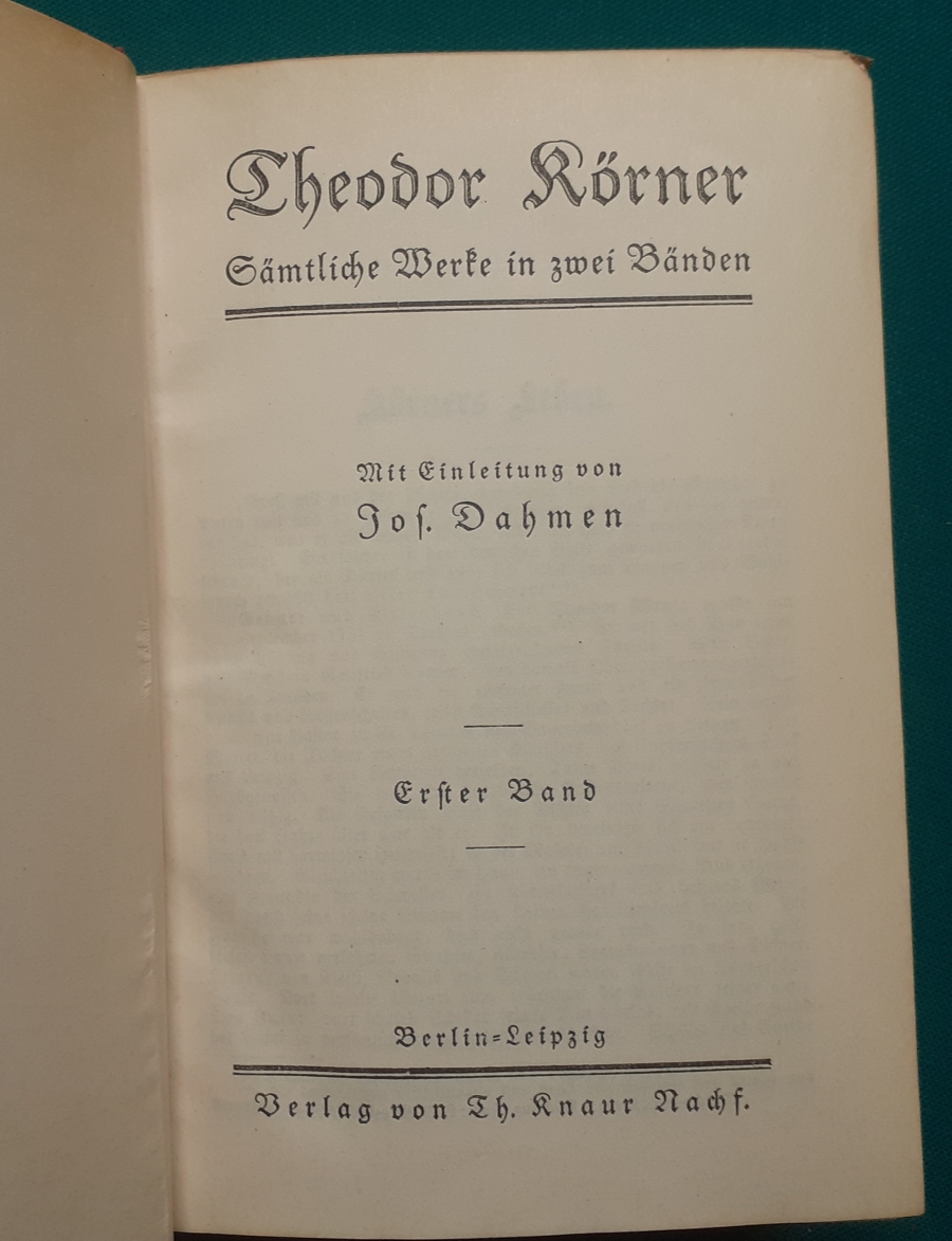 Theodor Körners sämtliche Werke Knaur Verlag, Berlin u.a.; Biografie von Josef Dahmen; Ausgabe um 1910; 412 und 390 Seiten; sehr dekorativer Einband mimt Lederrücken und -Ecken sowie einem festen Hartpappeinband; insgesamt guter altersgemäßer Zustand Preis 7 EUR |