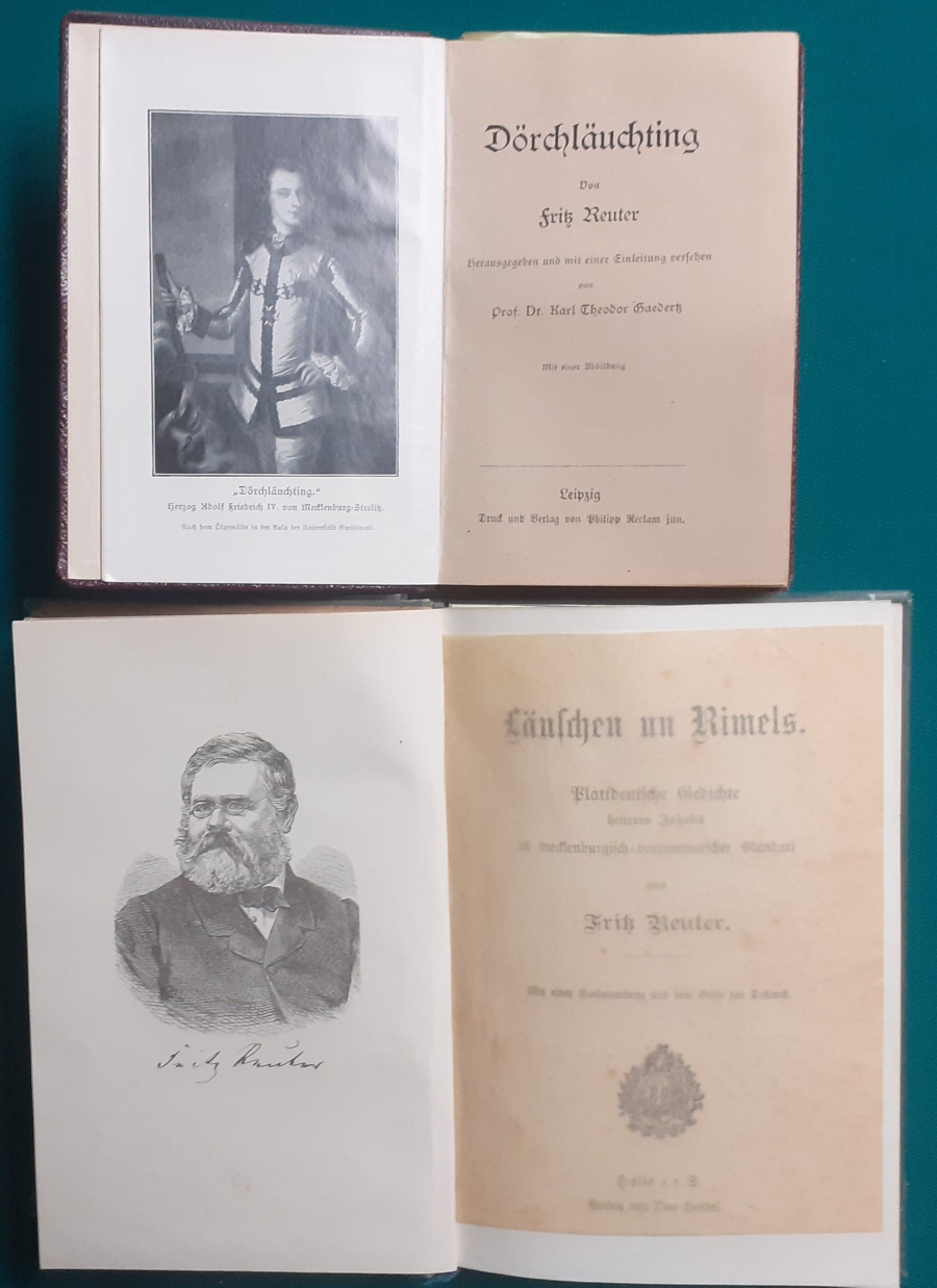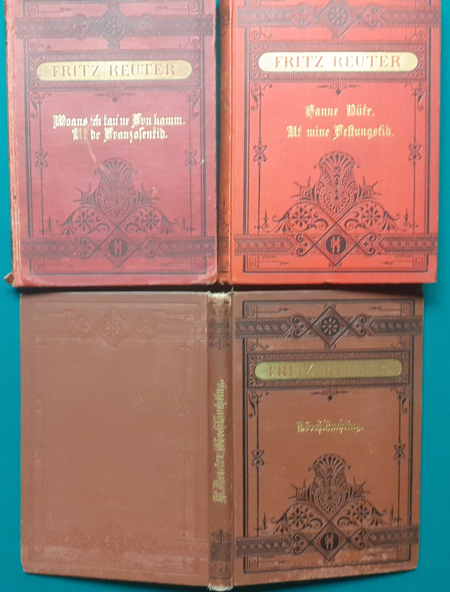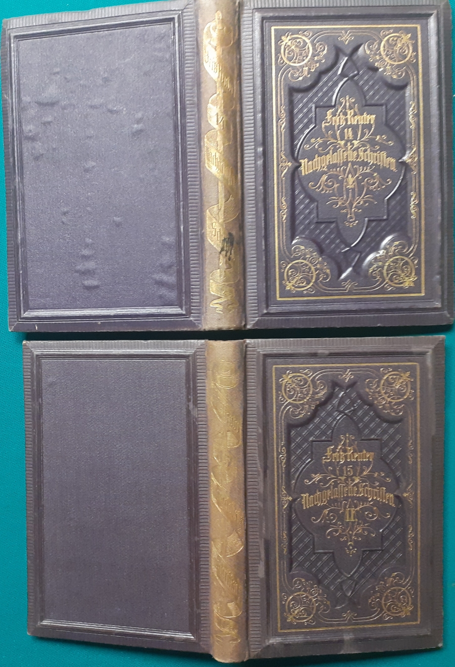 Fritz Reuter: Nachgelassene Schriften Ausgaben der Hinstorff´schen Hofbuchhandlung Wismar u.a.; Ausgaben von 1874 und 1875!!; 236 und 280 Seiten; jeweils Ledereinbände mit Goldaufdruck im Format 18 x 12 cm; sehr feste und stabile Bindung; Rücken des ersten Bandes etwas fleckig; sonst sehr guter altersgemäßer Zustand Gesamtpreis beider Bände: 19 EURO |