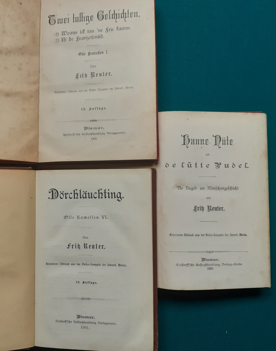Reihe von aus der Reihe der Volks-Ausgaben der Hinstorffschen Hofbuchhandlung Verlagscoonto in Wismar, jeweils rote oder bräunliche Bände in Voll-Leinen mit Goldschrift-Aufdruck vorn und einem speziellen Muster (siehe Abbildungen), Format jeweils 17 x 13 cm: Serie: Olle Kamellen I: Serie: Olle Kamellen II.: Serie: Olle Kamellen VI: |