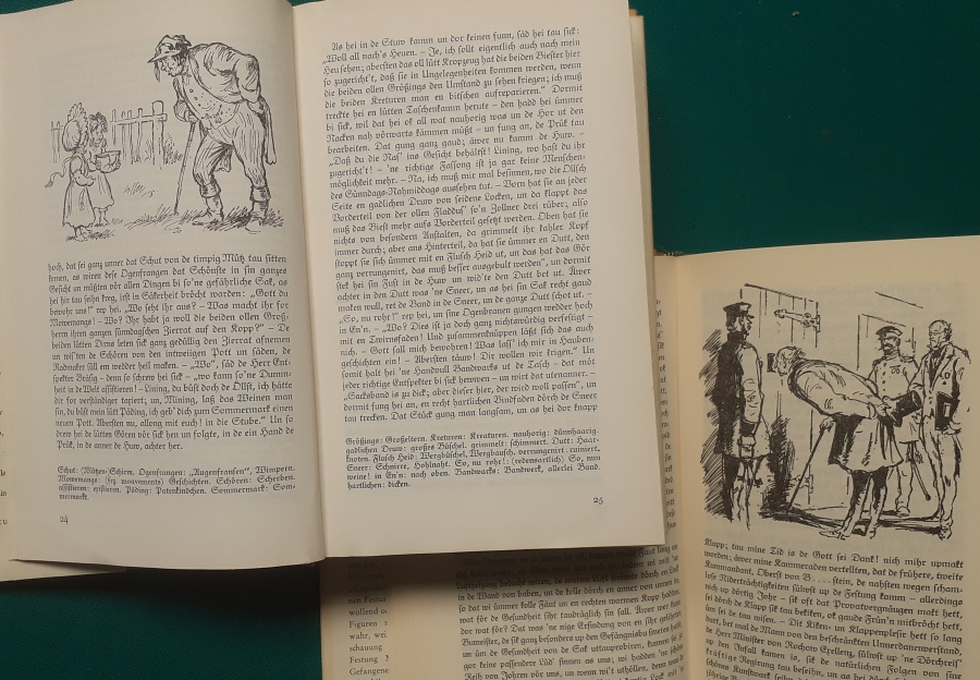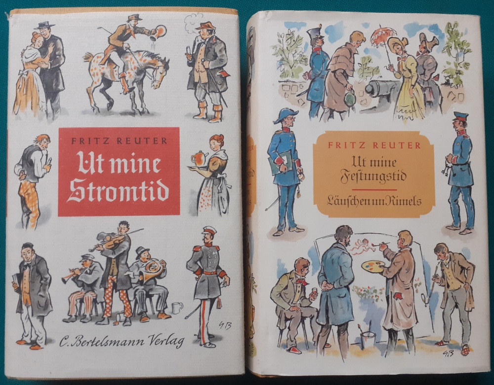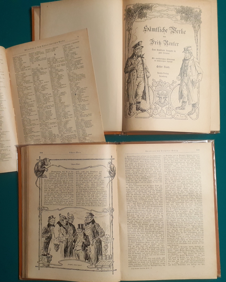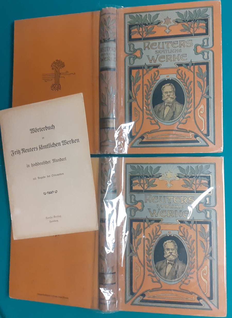 Werke von Fritz Reuter Neue illustrierte Ausgabe in zwei Bänden mit ausführlichem Wörterbuch in hochdeutscher Sprache, Hansa Verlag Hamburg, Ausgabe um 1900, 584 und 536 Seiten, 24seitiges Wörterbuch, sehr fester Voll-Leinen Einband, 24 x 18 cm, Zustand altersgemäß gut, Preis komplett: 24 EURO |
