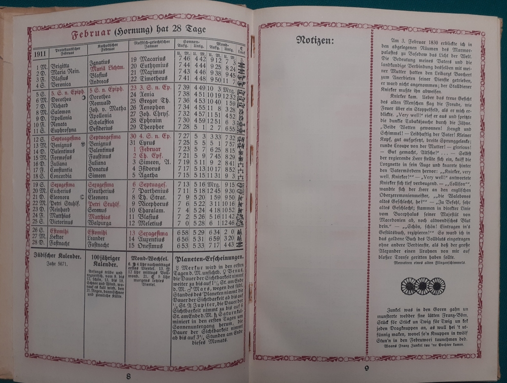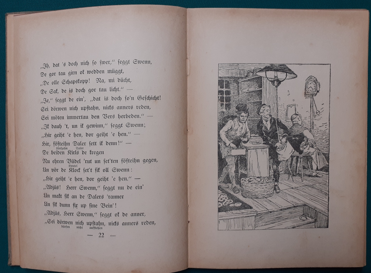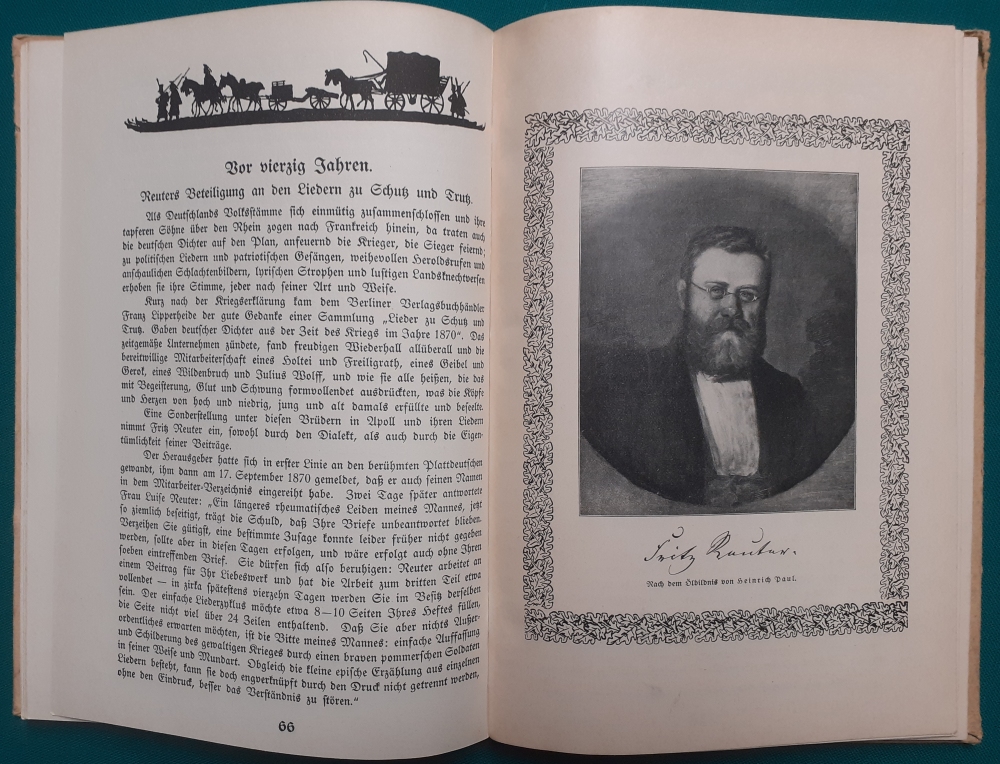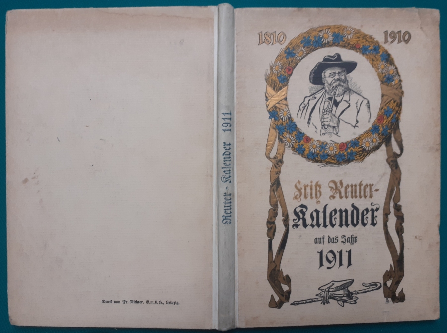 Reuter - Kalender Hrsg. von Karl Theodor Gaedertz, mit Schmuck und Silhouetten von Johann Bahr, Porträts von Fritz Reuter und Paul Spangenberg, handschriftlichen Gedichten Reuters, Abbildungen nach alten Original-Vorlagen Ausgabe von 1910, 110 Seiten, Leinenrücken mit Hartpappeinband; Einband ziemlich fleckig; Knick an einer oberen Ecke; Einband in sich etwas verbogen; innen noch sehr schön; Zustand altersgemäß befriedigend, Preis: 8 EURO |