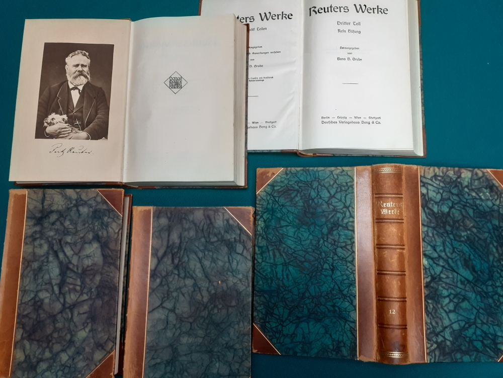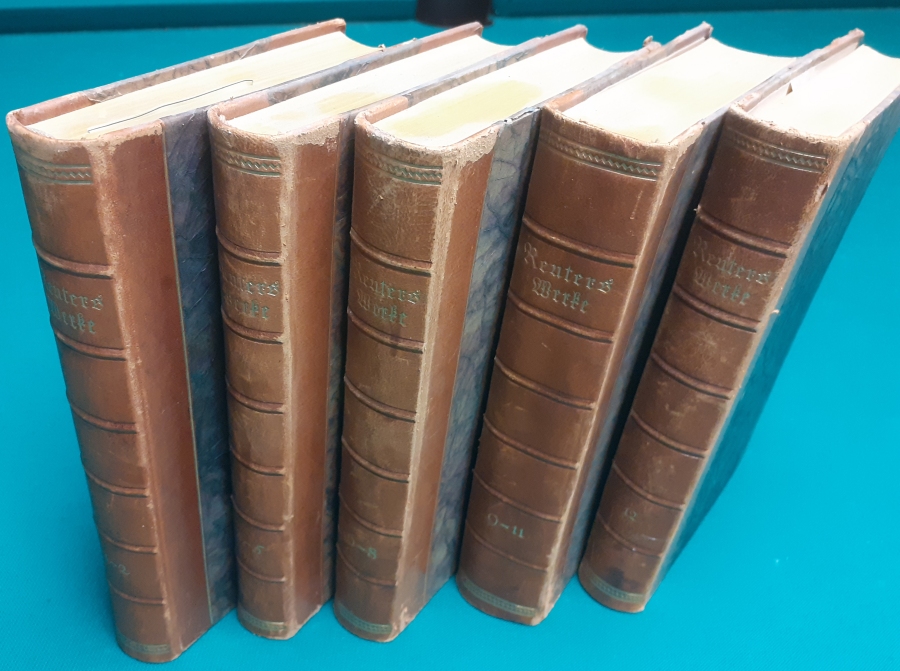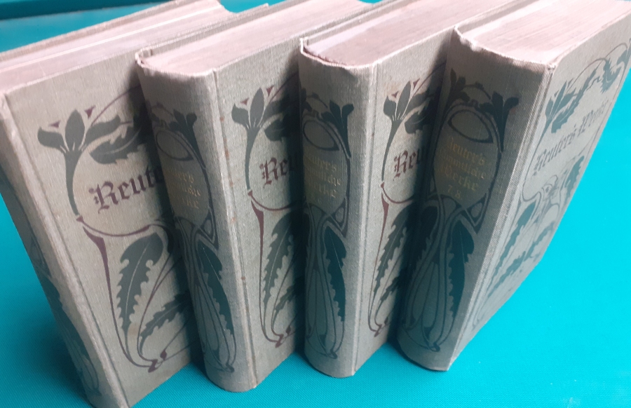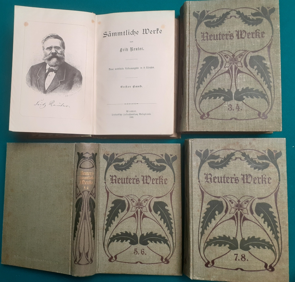 Werke in 8 Bänden (= 4 Bücher) Hinstorff´sche Hofbuchhandlung, Wismar, Ausgabe von 1902, jeweils feste Voll Leinen Einbände in dekorativem Jugendstil im Format 18,5 x 12,5 cm, Zustand altersgemäß gut, Preis komplett: 25 EURO |