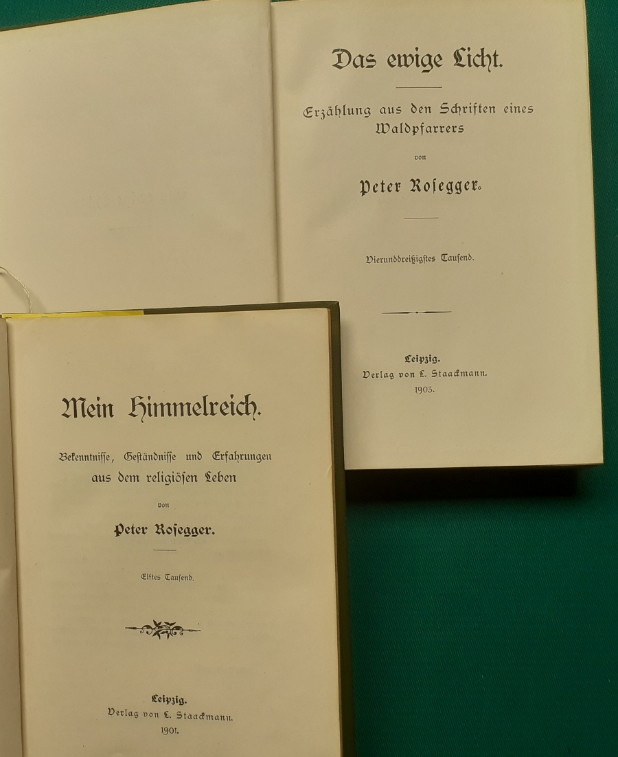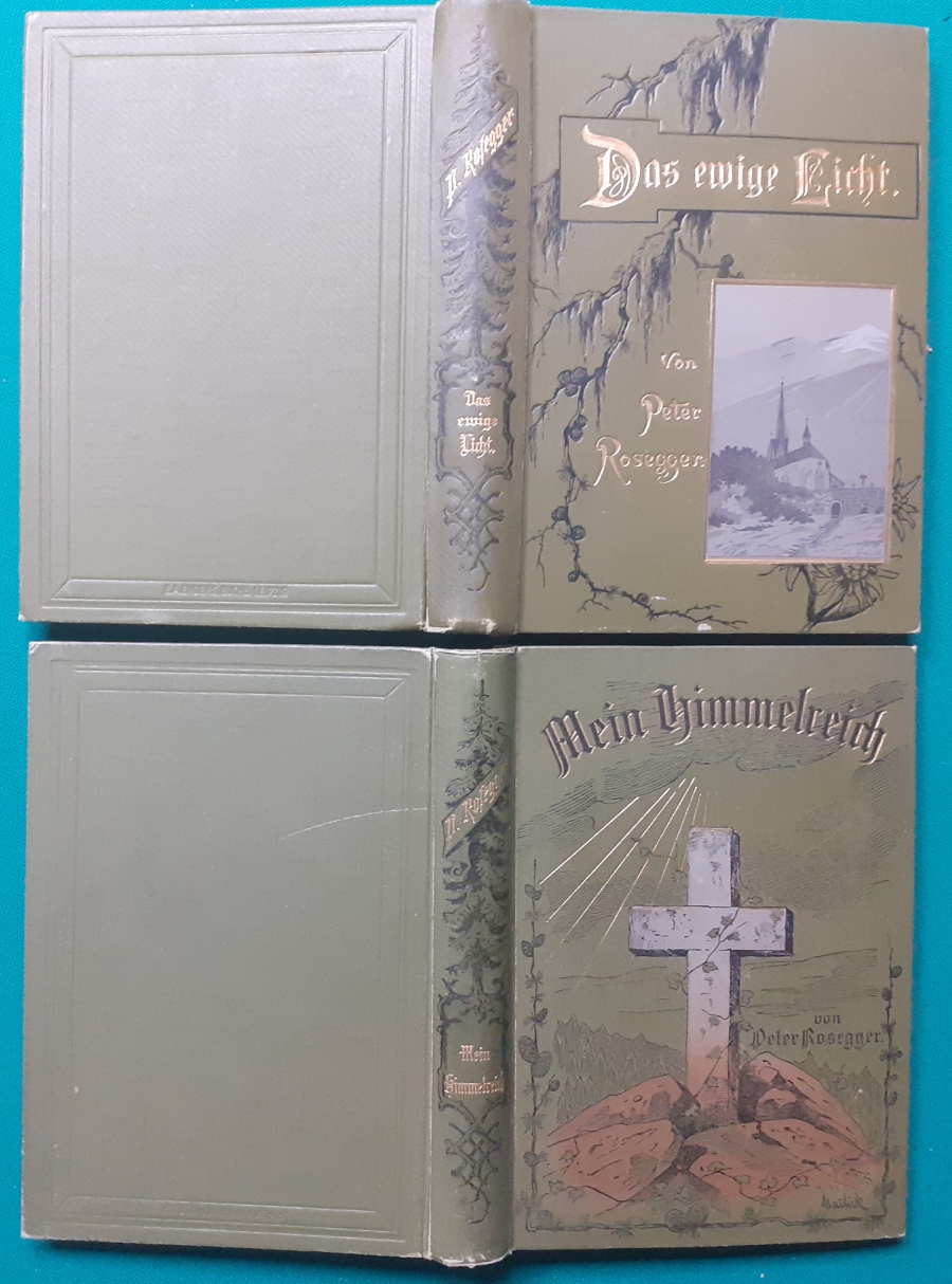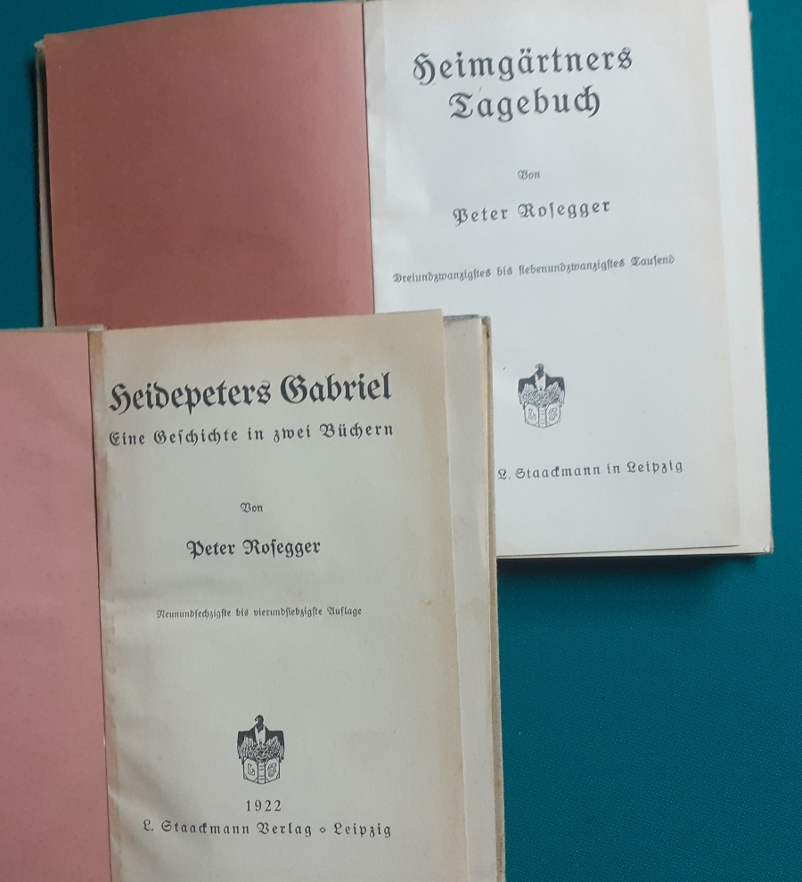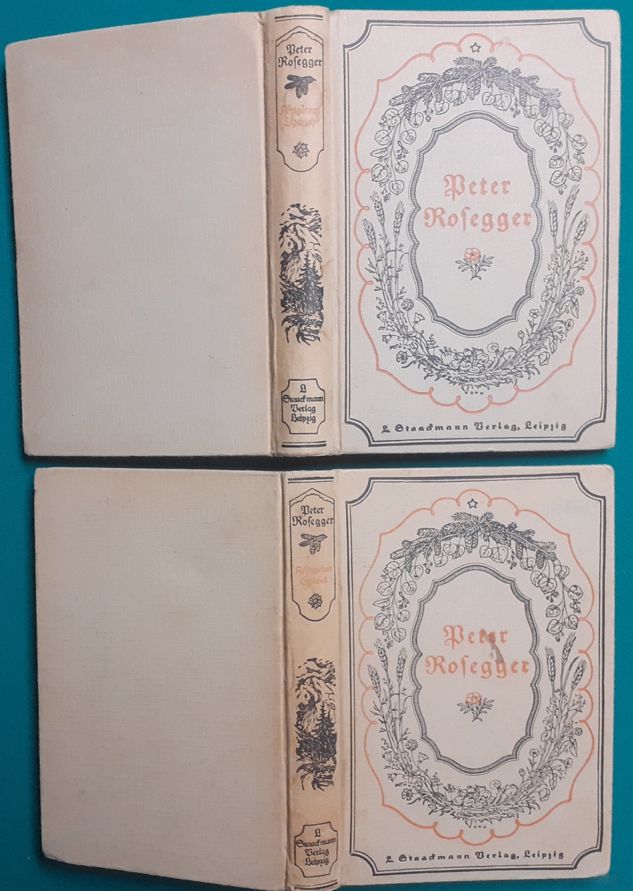 Die Reihe der Bände aus dem Staackmann, Verlag, Leipzig um 1900; es handelt sich um Voll Leinen Einbände im Format 19 x 13 cm in jeweils sehr dekorativem Titelbild Peter Rosegger