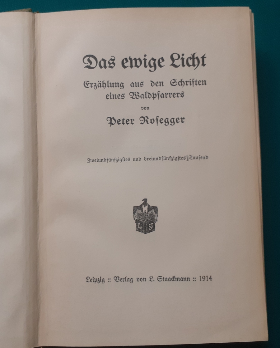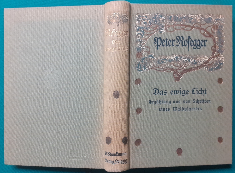 Peter Rosegger Das Ewige Licht Erzählung aus den Schriften eines Waldpfarrers Staackmann Verlag Leipzig, Ausgabe von 1914, 430 Seiten, schöner dekorativer Voll-Leinen Einband, Buch in altersgemäßem guten Zustand Preis: 6 EUR |