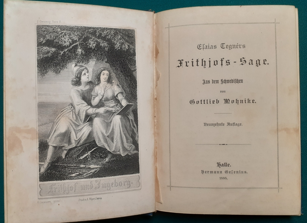 Esaias Tegnér Die Frithjofs-Sage Gesenius Verlag, Halle, Ausgabe von 1885; 226 Seiten; sehr dekorativer Voll-Leinen Einband mit Goldschnitt auf allen Kanten, Format 16,5 x 12 cm; Einband etwas fleckig; etwas an den Buchkanten bestoßen; sonst guter altersgemäßer Zustand, Preis 12 EUR |