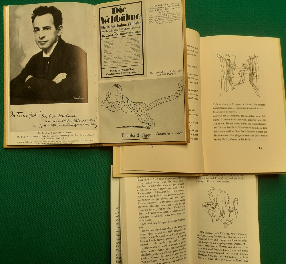 Wrobel, Theobald Tiger, Peter Panter, Kaspar Hauser und Kurt Tucholsky Hrsg. Tucholsky Gedenkstätte Schloß Rheinsberg; Text: Peter Böthig; Ausgabe um 2008; auf festem Papier; an den Ecken mit Klarsichtfolie verstärkt; dort Befestigungspunkte für Hetzwecken etc.; sonst sehr guter altersgemäßer Zustand Preis: 12 EURO Anmerkung: Dieses Poster ist ohne Falten gerollt. Der Rollenversand kostet leider zuzüglich 9 EURO; zweimal geknickt betragen die Versandkosten als Brief 2,90 EURO. |