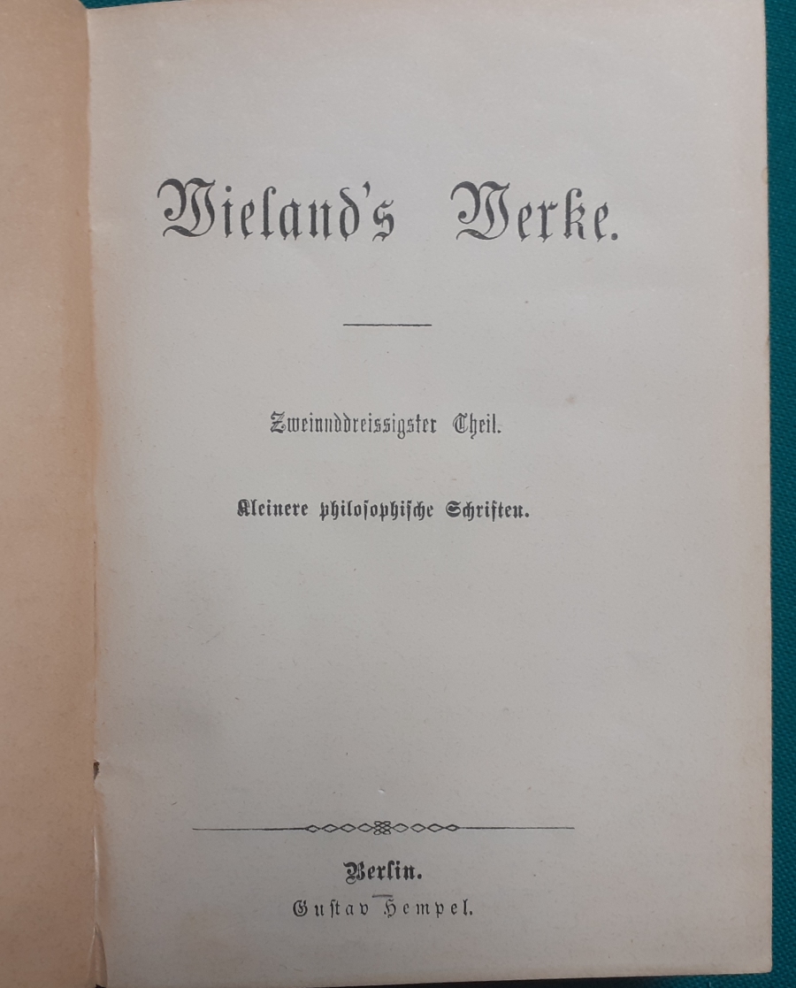 Wielands Werke Hempel Verlag, Berlin; Ausgabe um 1890, 574 Seiten; sehr dekorativer Voll-Leinen Einband, Rückenschild verblaßt; Buchblock im Vor- und Nachsatz innen gelockert und mit Klebeband stabilisiert; Bindung ansonsten ok. und alle Blätter fest; noch befriedigender altersgemäßer Zustand Preis 5 EUR |