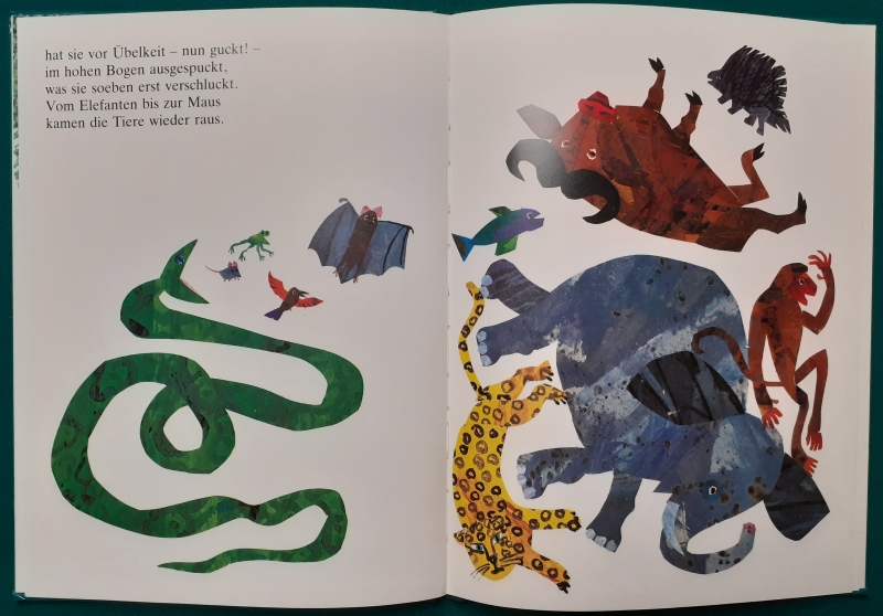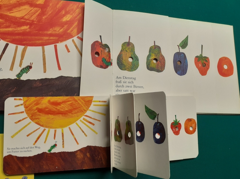 Das wohl populärste Bilderbuch Spielbilderbuch mit verschieden groß abgestimmten Seiten mit Löchern in den Früchten: Die kleine Raupe Nimmersatt Abbildung oben links: