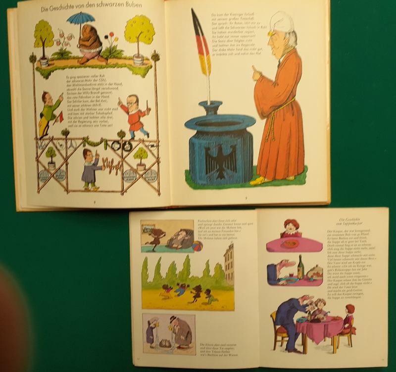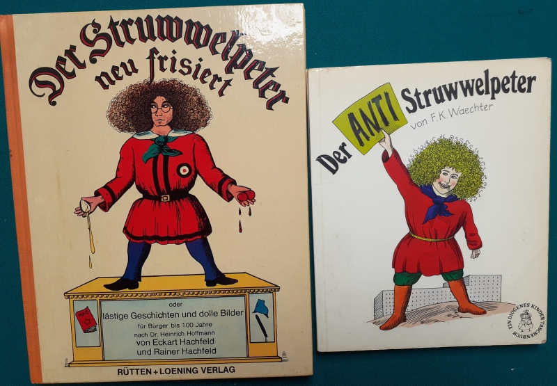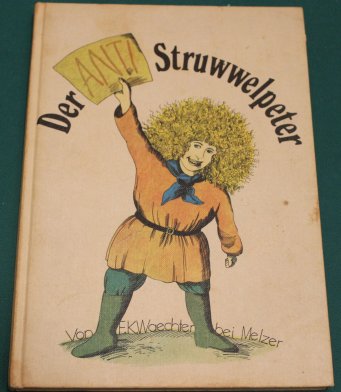 Struwwelpeter-Variation: Der ANTI Struwwelpeter von Friedrich Karl Waechter, Joseph Melzer Verlag; Frankfurt, Ausgabe von 1970, fester Hardcover-Einband mit ca. 30 Seiten, Format 24,5 x 17,5 cm, Einband fleckig - auch innen einige braune Flecken; sonst aber ok. und gepflegt und altersgemäßer guter Zustand, Preis: 8 EUR |