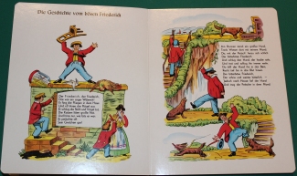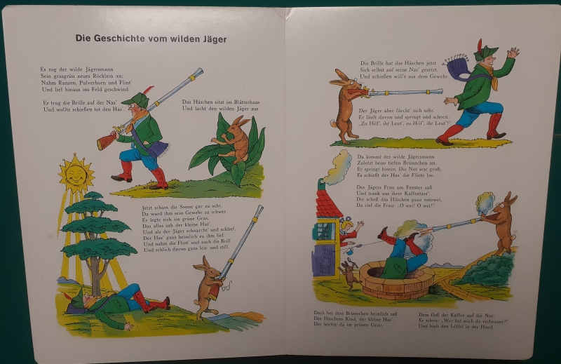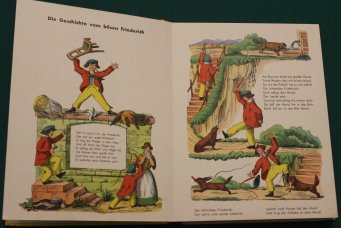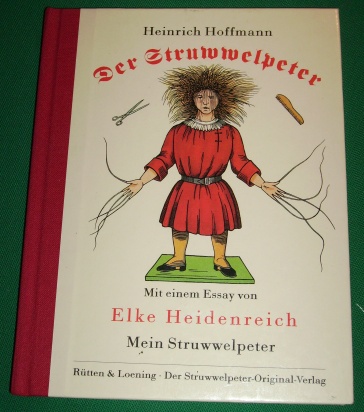 Heinrich Hoffmann: Rütten und Loening Verlag Berlin, Ausgabe von 1995, 64 Seiten, mit einem Essay "Mein Struwwelpeter" (Umfang 30 Seiten) von Elke Heidenreich über die Geschichte des Struwwelpeters, Leinenrücken mit lackiertem Hartpappeinband; altersgemäßer sehr guter Zustand - offenbar kaum gelesen, Preis: 8 EUR Hier zur Illustratoren-Galerie mit typischen Arbeiten von Fritz Kredel |