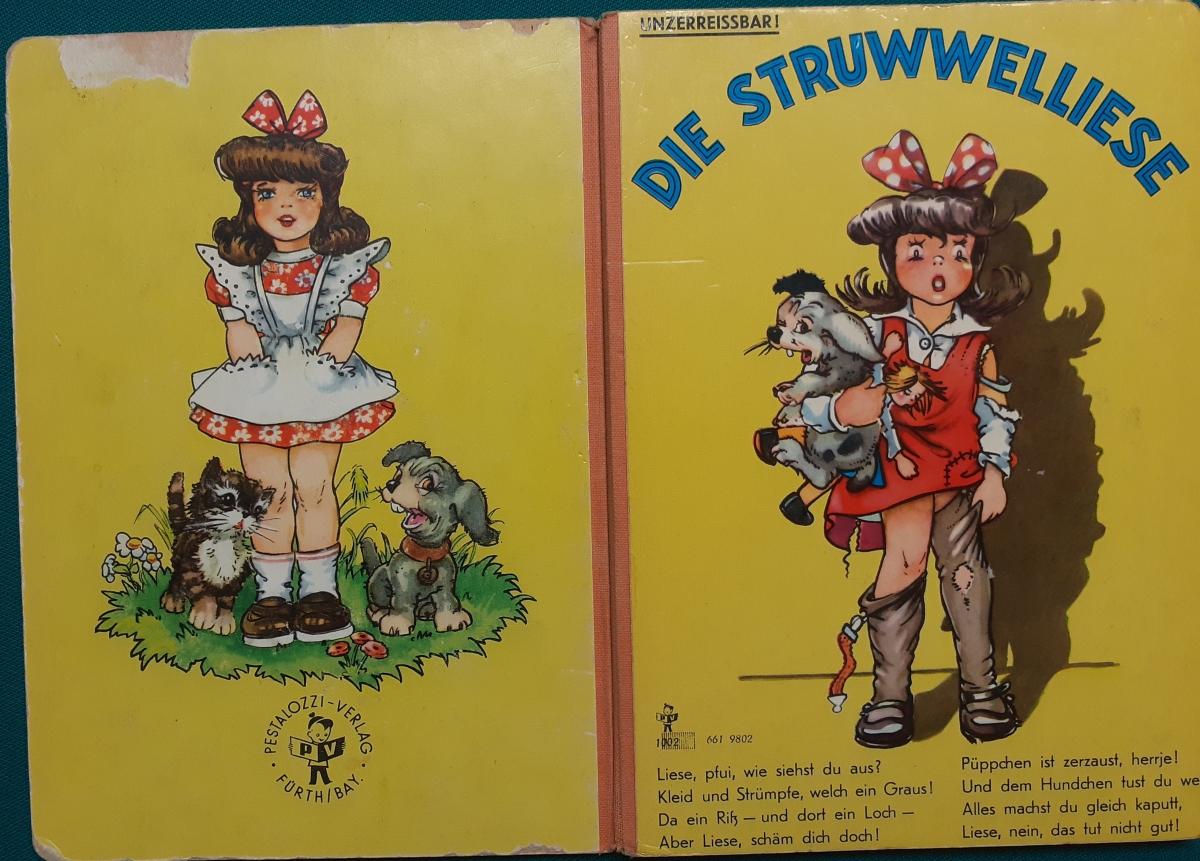Pestalozzi-Verlag Bilder von Charly Greifoner; Text von Cilly Schmitt-Teichmann: Die Struwwelliese Pestalozzi-Verlag; Bilderbuch-Nr. 661 9802 (vormals 1002), Ausgabe um 1965, 20 Seiten in stabilem Hartkarton im Format 22 x 16 cm; Leinenband am Rücken; hochglanzlackierter Einband, an den Heftkanten etwas bestoßen; Kanten am hinteren Einband berieben und etwas beschädigt; insgesamt noch recht guter altersgemäßer Zustand, Preis: 7 EUR |