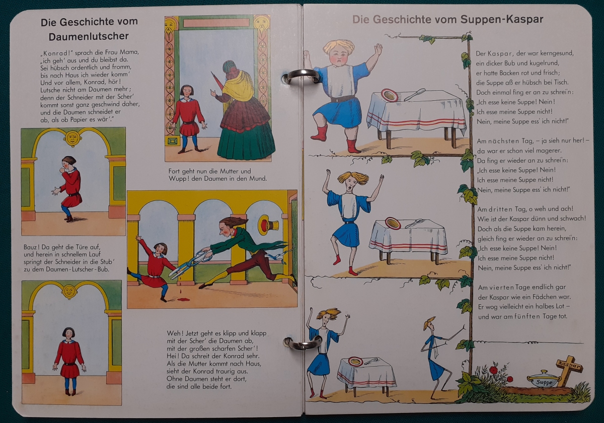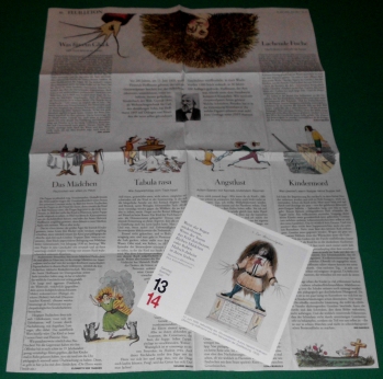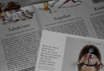 Zeitungsartikel aus der Wochenzeitung bestehend aus sechs Artikeln von ZEIT-Autoren zu sechs Geschichten aus dem Struwwelpeter; dazu gehört auch noch ein Original-Kalenderblatt vom 13./14. Juni 2009 mit biografischen Daten zu Heinrich Hoffmann sowie einer Zeichnung Hoffmanns zum Struwwelpeter aus dem Manuskript der Zweitfassung von 1858:
