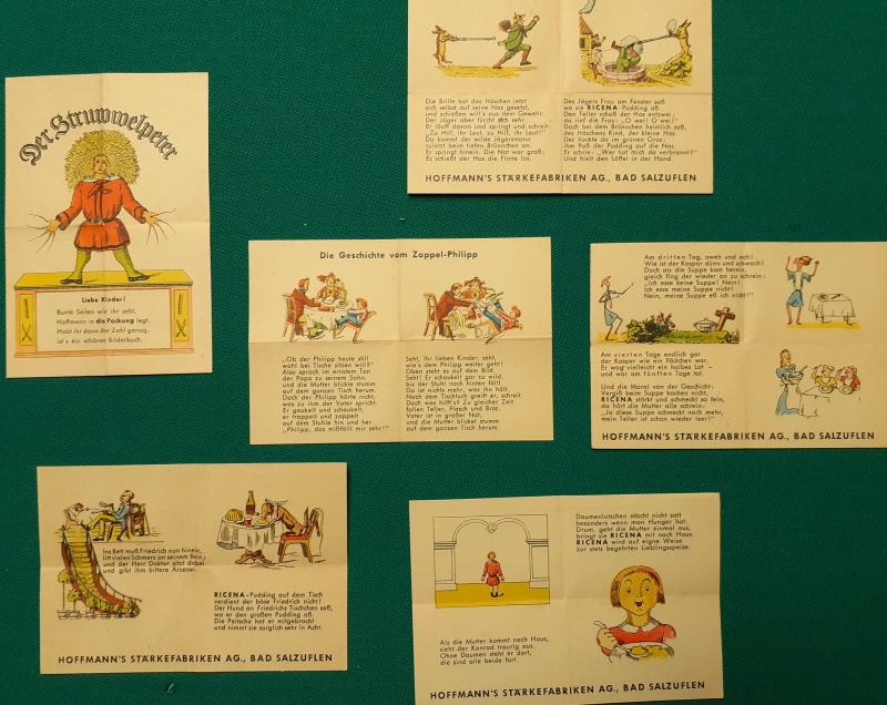 der Serie bestehend aus einer Serie von sechs Werbeblättchen (incl. Titel - siehe Abbildung), Ausgabe um 1970, Vor- und Rückseite der Blätter beschrieben und original farbig illustriert: die Original-Reime wurden mit RICENA-Pudding verändert, Format jeweils 10,5 x 7,5 cm, alle Blättchen jeweils 2 x gefaltet; alle in sehr gutem altersgemäßen Zustand,