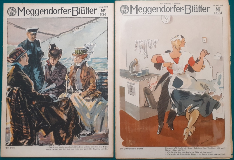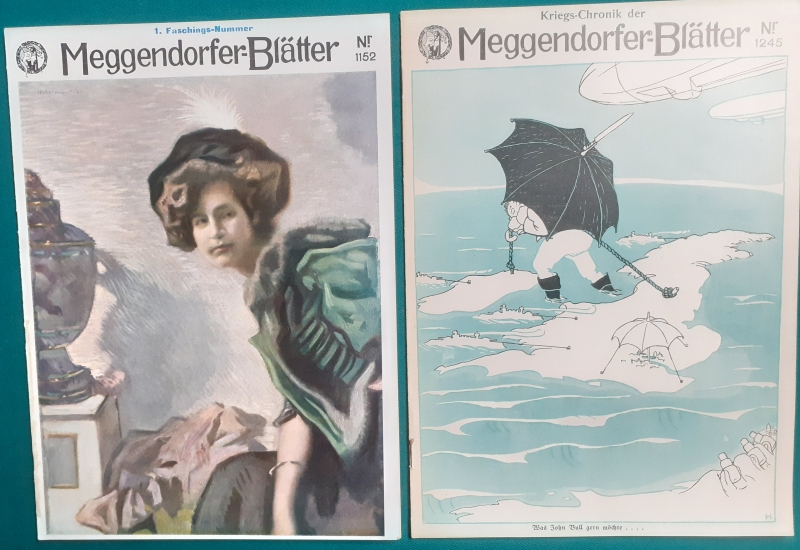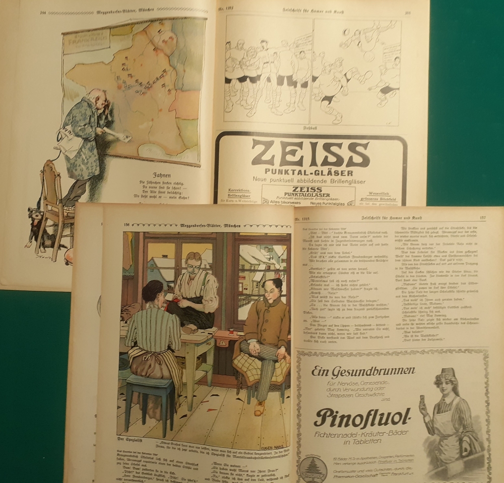 1336 | 3.8.1916 | Der gefragte Artikel v. Peter Robinson ... | Beilage: 2 Seiten "Kriegschronik der Meggendorfer-Blätter" mit satirischen Beiträgen zum Kriegsgeschehen; Umfang ca. 16 Seiten; mit sehr viel wunderbarer zeitgenössischer Werbung; guter altersgemäßer Zustand | 8 |